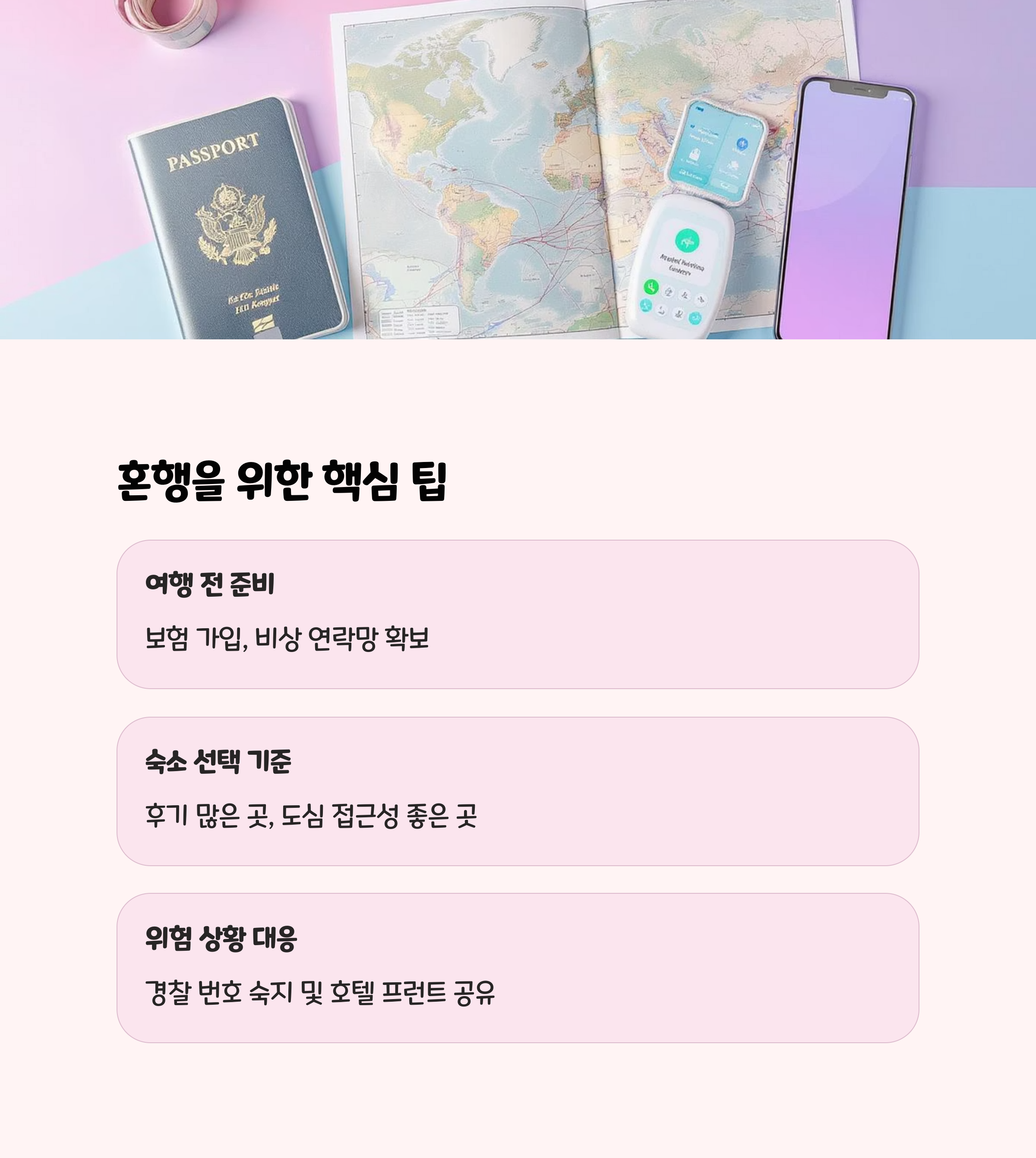 | 여행 전 준비 | 보험 가입, 비상 연락망 확보 |