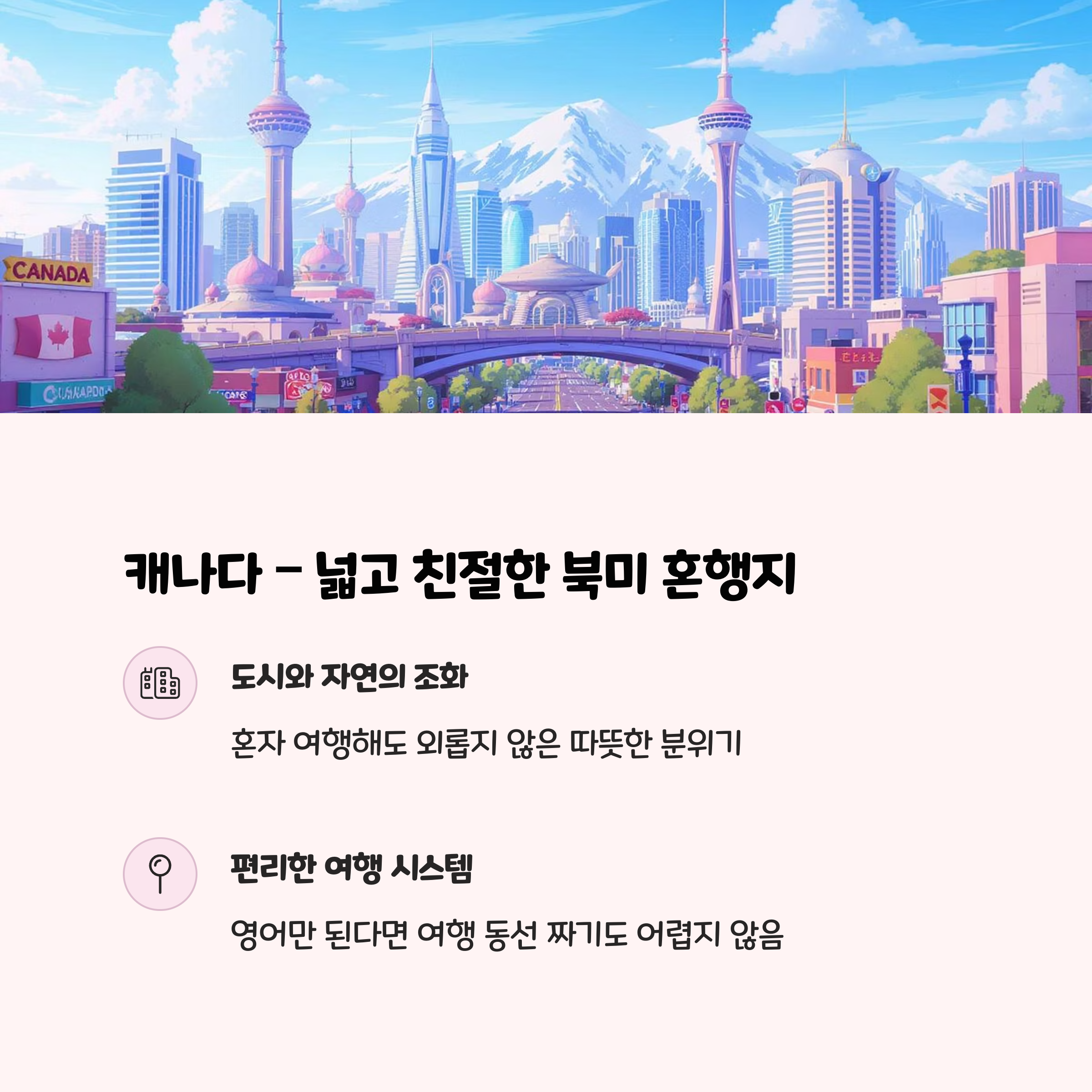 | 캐나다 | 높음 | 중간 | 매우 높음 | 도시+자연 복합 여행 |