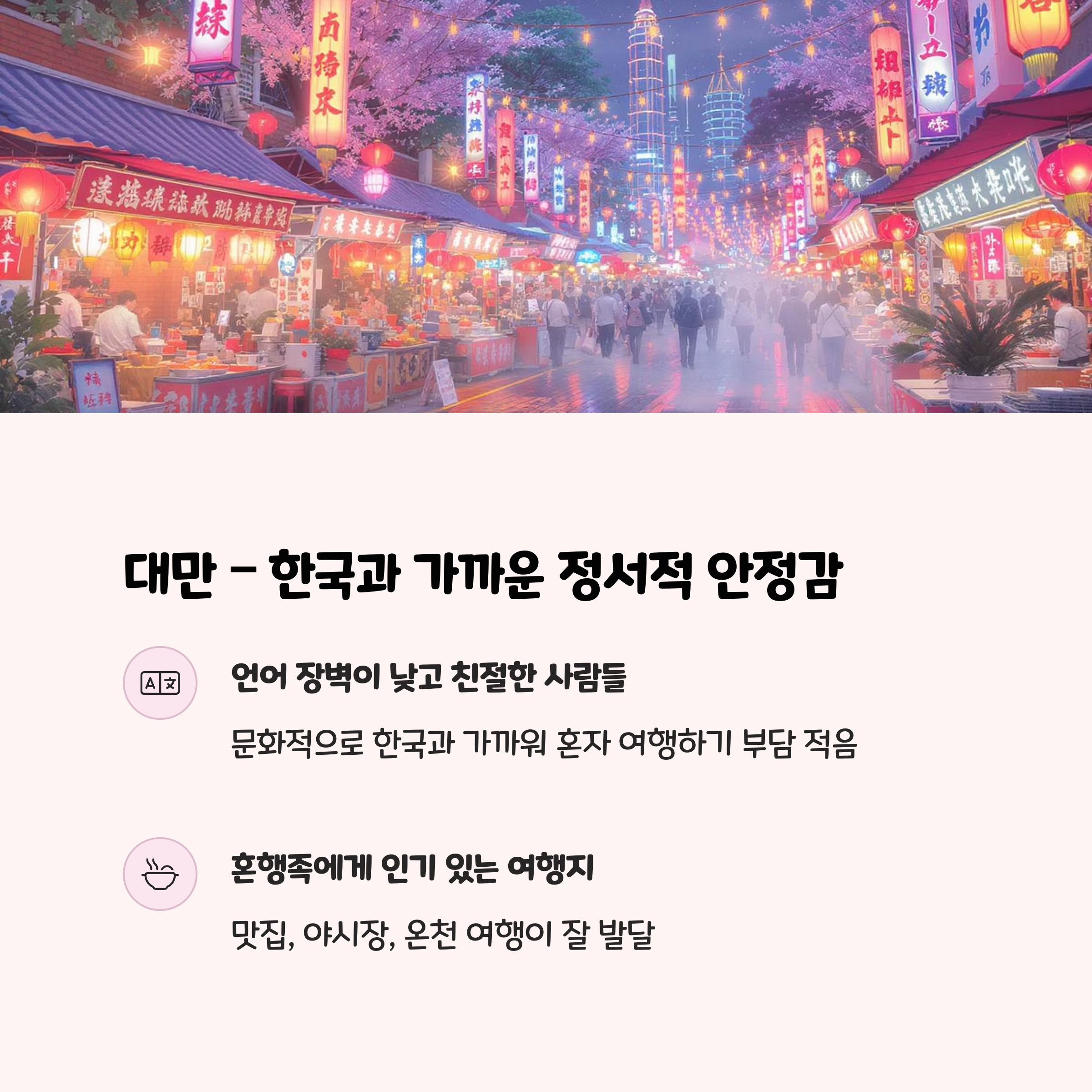 | 대만 | 높음 | 낮음 | 낮음 | 야시장 탐방, 온천 |