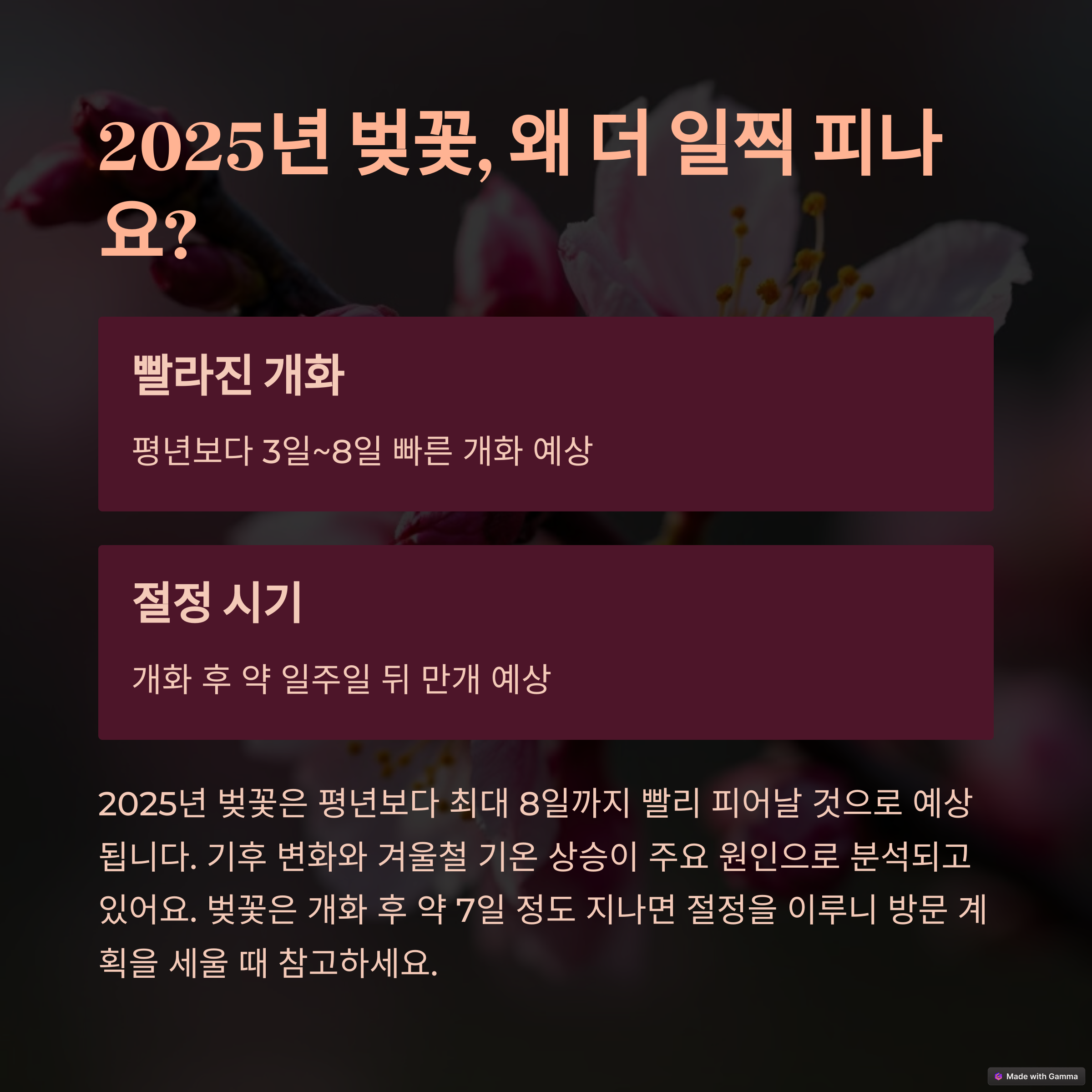 | 3월 23일 개화, 벚꽃 명소 다대포·온천천 추천 | 2025년 3월 29일~4월 6일 진해 일대 축제 진행 | 서귀포 시작으로 남부→중부→북부 순차 개화 |