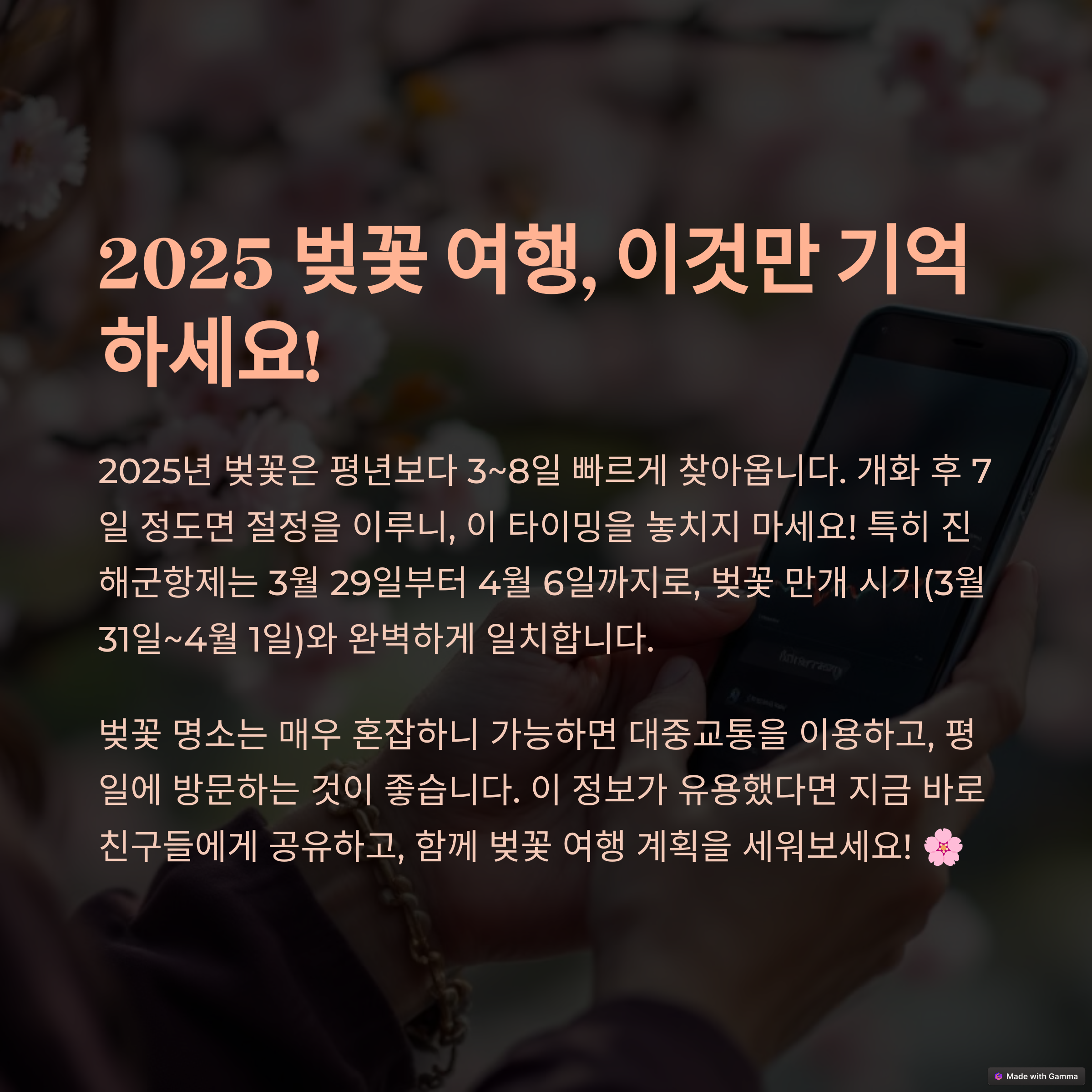 2025년 벚꽃 여행 계획은 어떻게 준비 중이신가요? 마음에 드는 장소나 추천하고 싶은 지역이 있다면 댓글로 함께 나눠보아요. 서로의 경험이 더 풍성한 여행을 만들어줄 거예요!