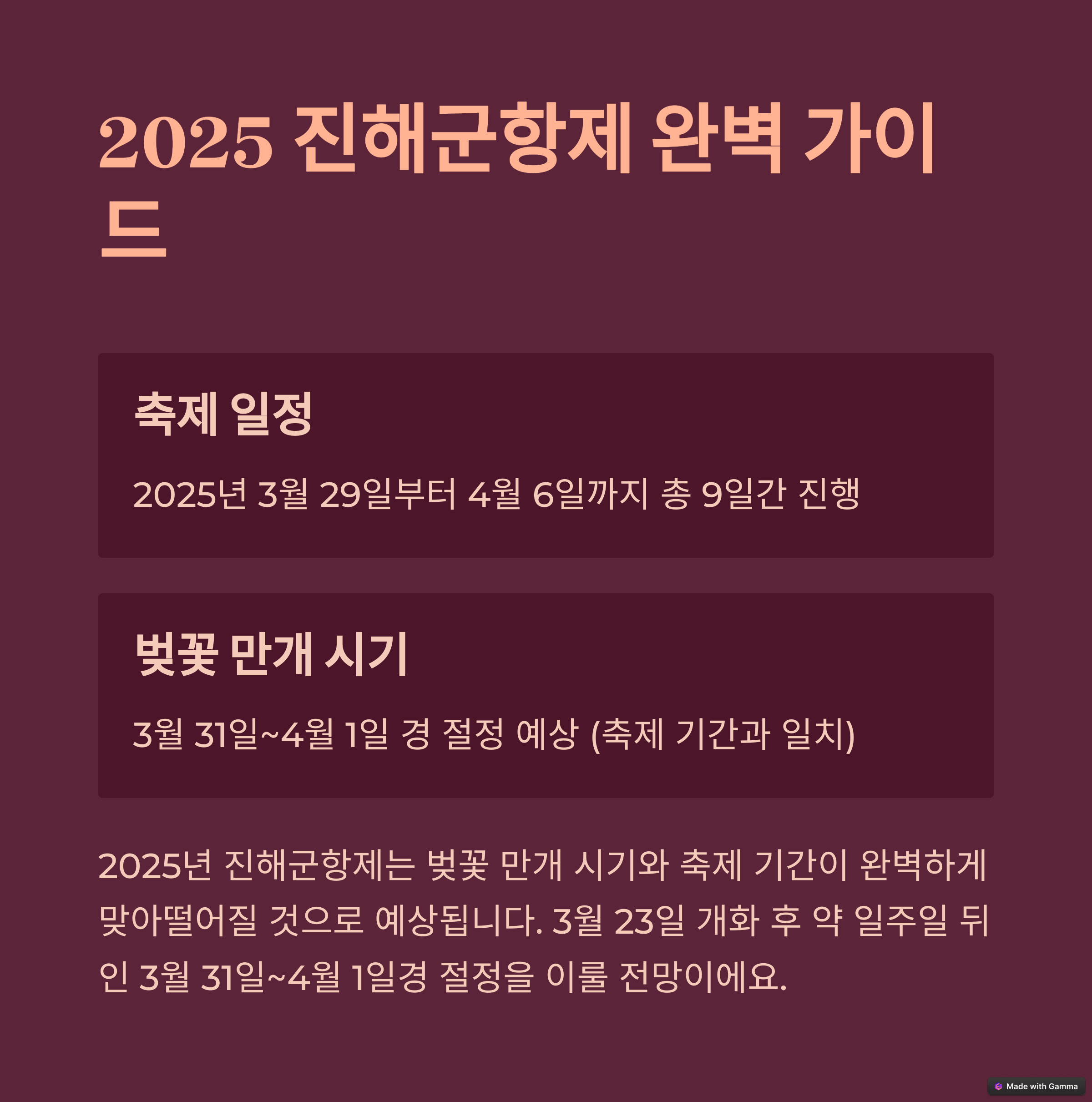 | 진해군항제 일정 | 2025년 3월 29일부터 4월 6일까지 9일간 진행 |