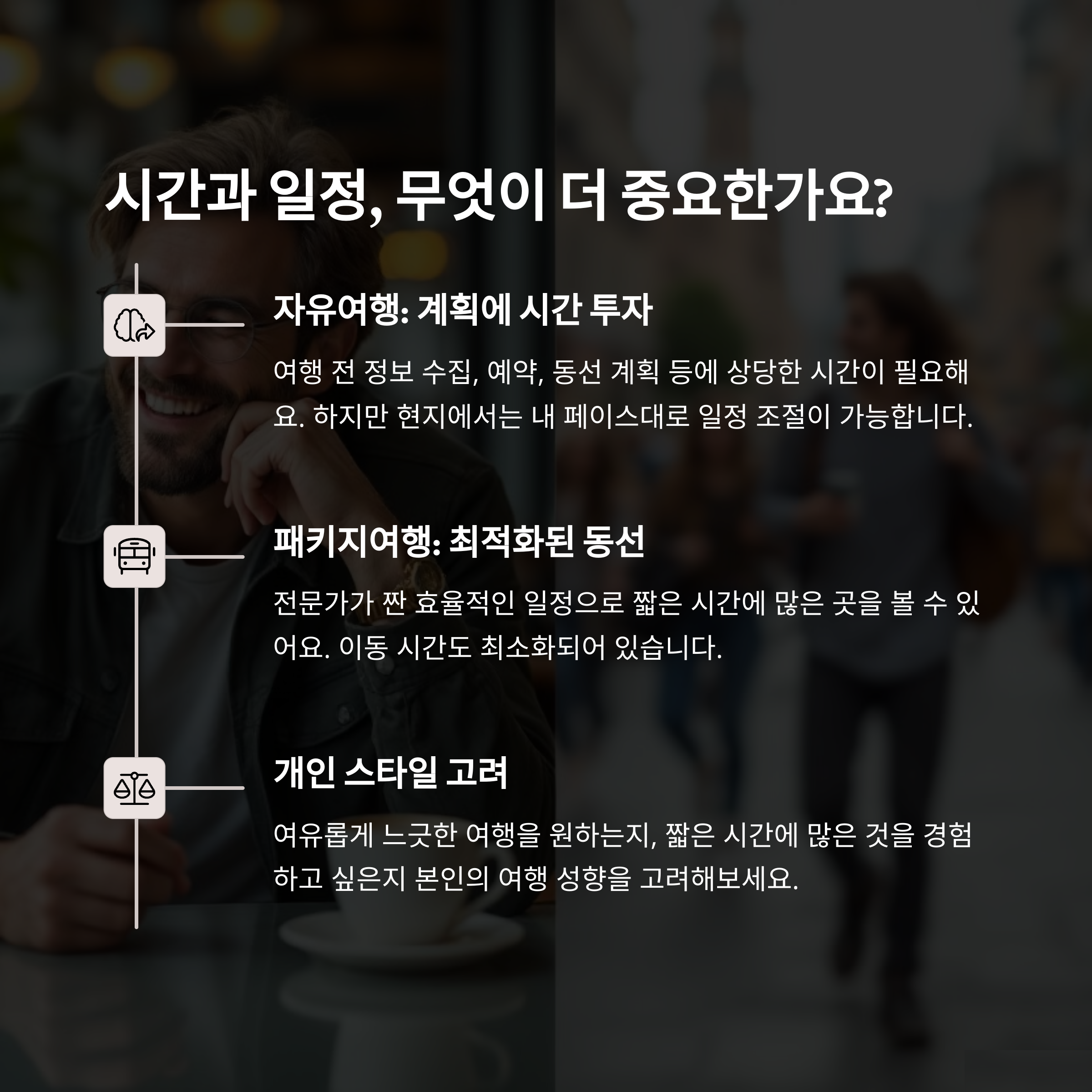 | 나만의 여행 스타일 추구 | 준비 시간 절약, 가이드 도움 | 자유로움 or 편안함 |