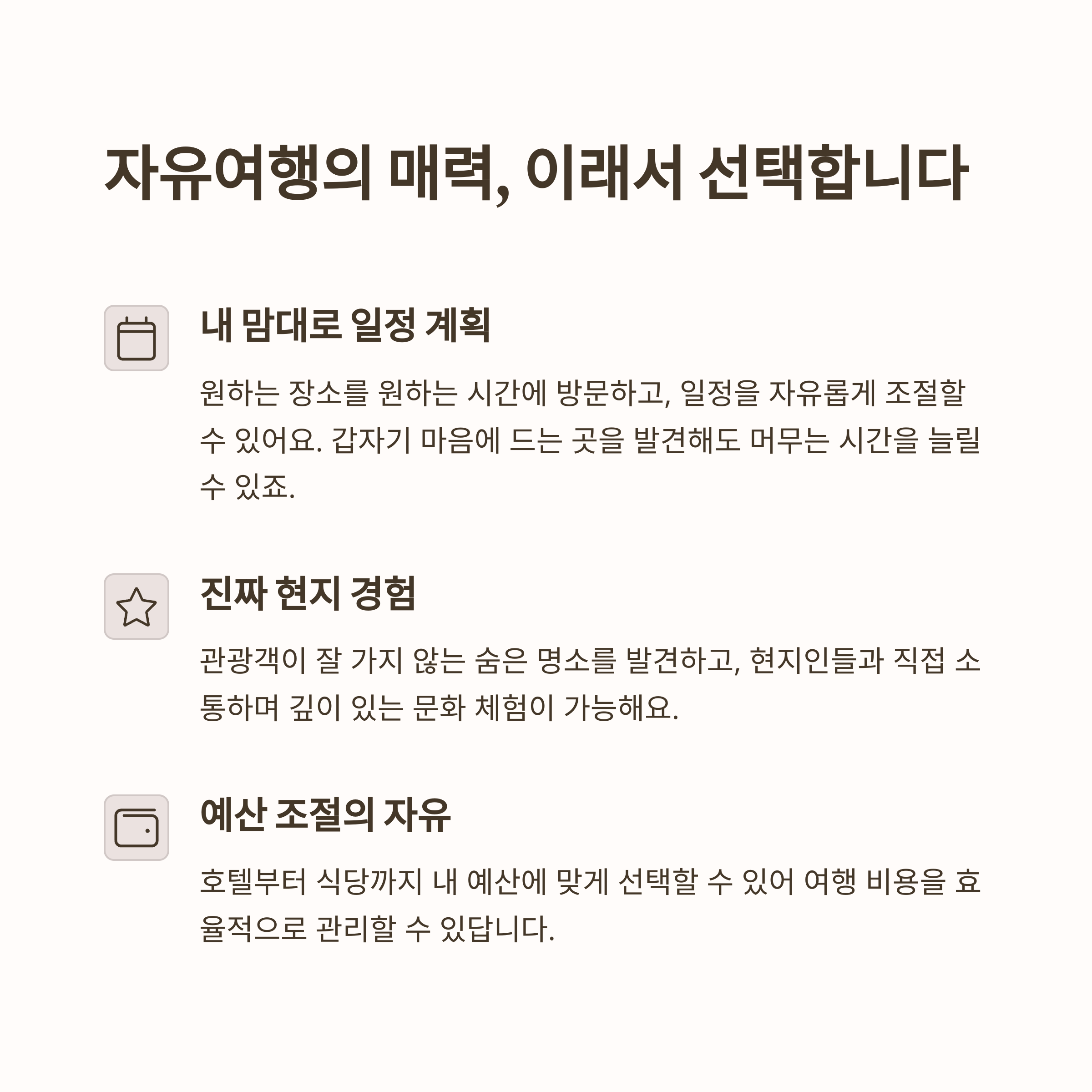 | 자유여행 장점 | 내가 원하는 일정대로 유연하게 계획 가능 |