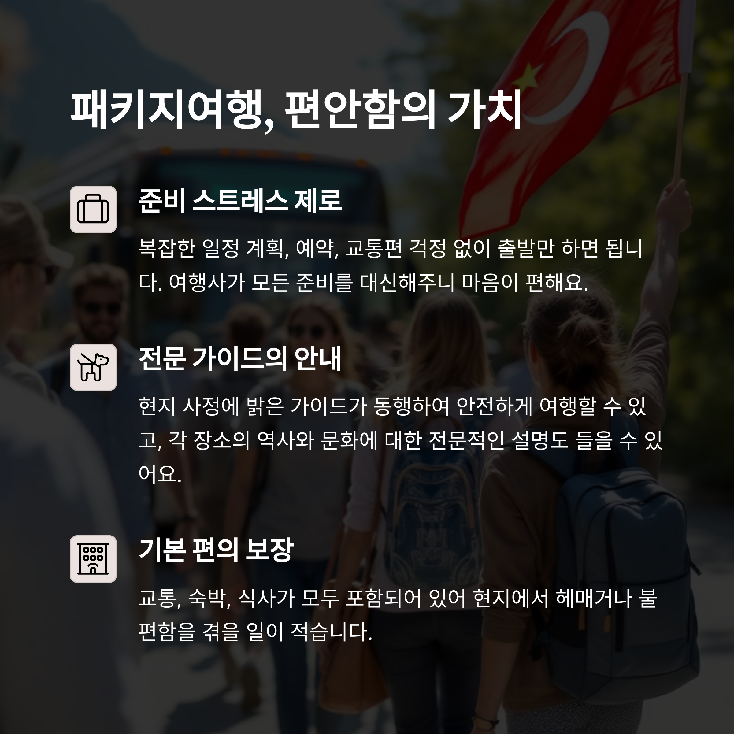 | 패키지여행 장점 | 준비 부담 없이 가이드와 함께 편안한 일정 진행 |