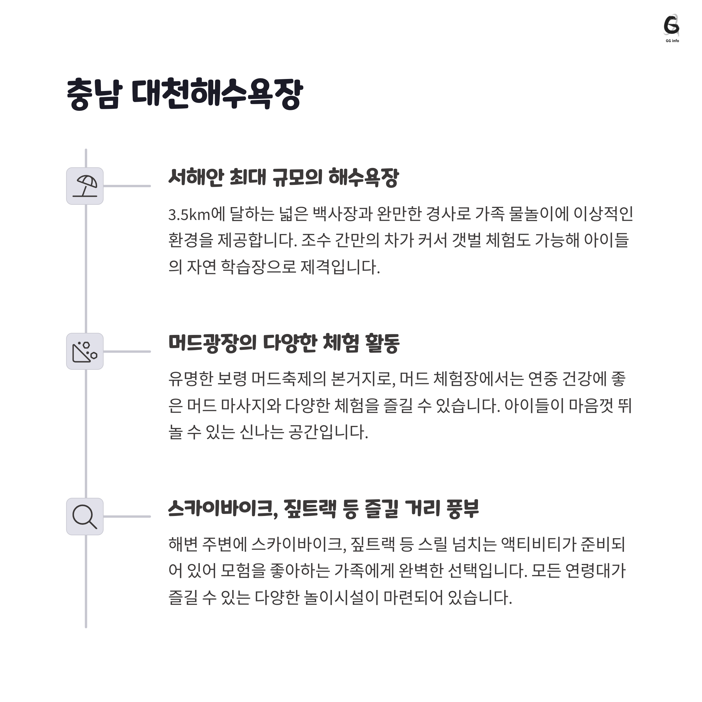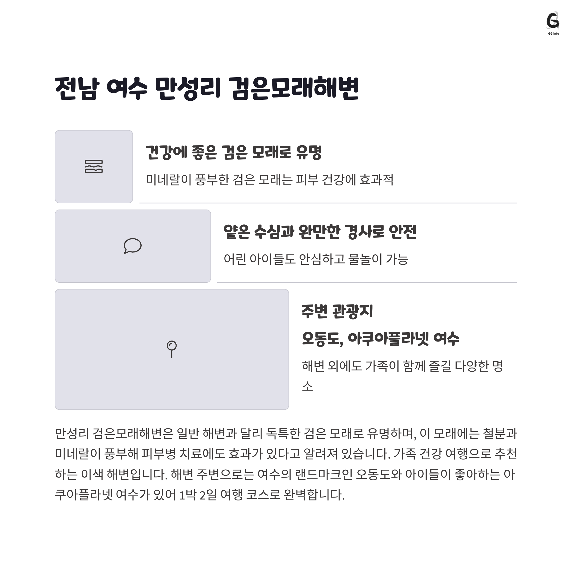 | 여행 목적 | 편안한 휴식, 아이들과 체험 활동, 맛있는 해산물 먹거리 |