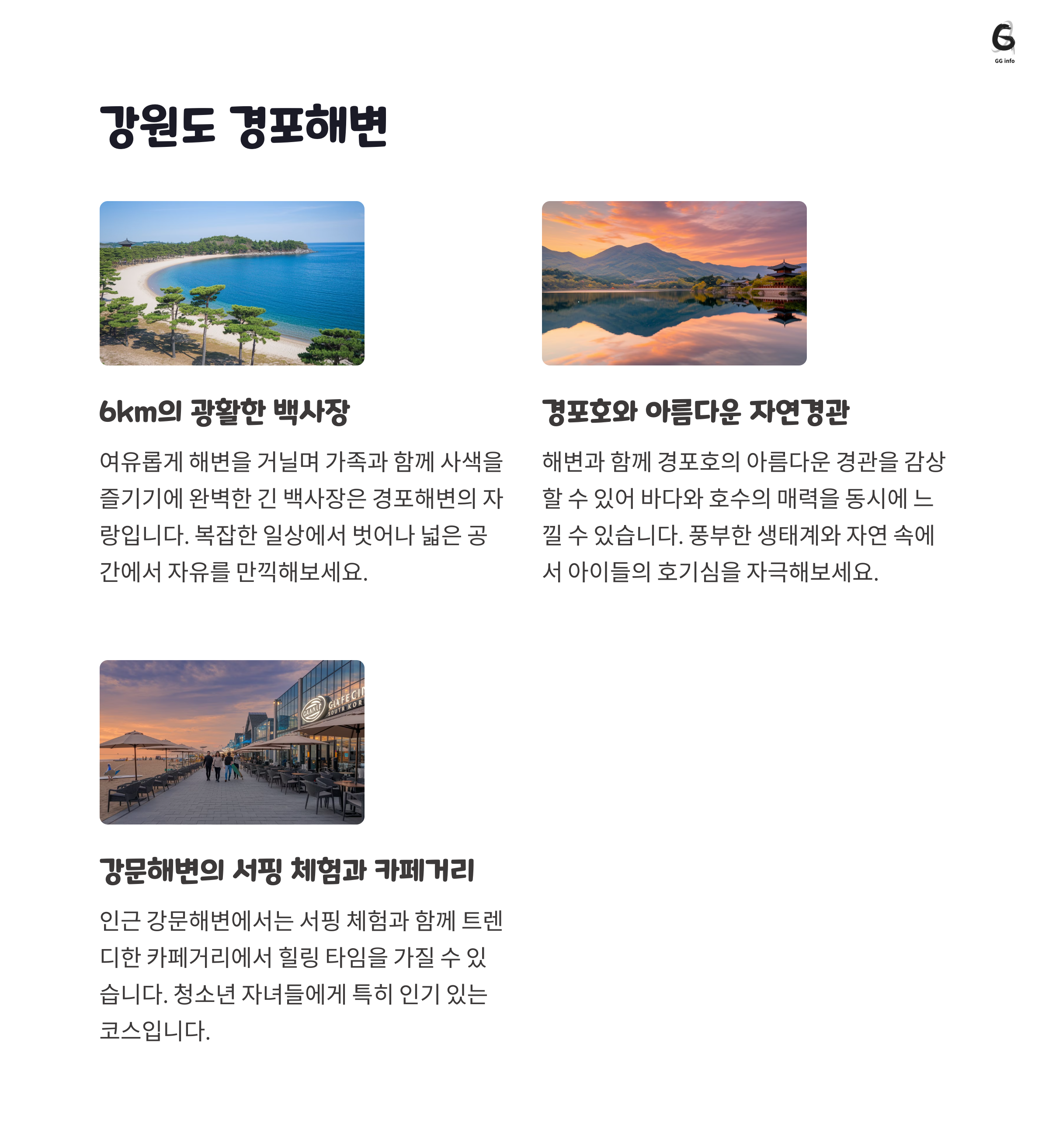 첫 번째 추천지는 강릉 경포해변입니다. 깨끗한 백사장과 맑은 물로 유명한 이곳은 가족 단위 여행객에게 인기가 많습니다. 해변 바로 옆에는 경포호가 있어 산책하기에도 좋고, 주변에는 다양한 해산물 맛집이 있어 먹거리까지 완벽하게 즐길 수 있습니다. 또한, 여름철에는 해변 축제가 열려 아이들과 함께 다채로운 경험을 할 수 있습니다.