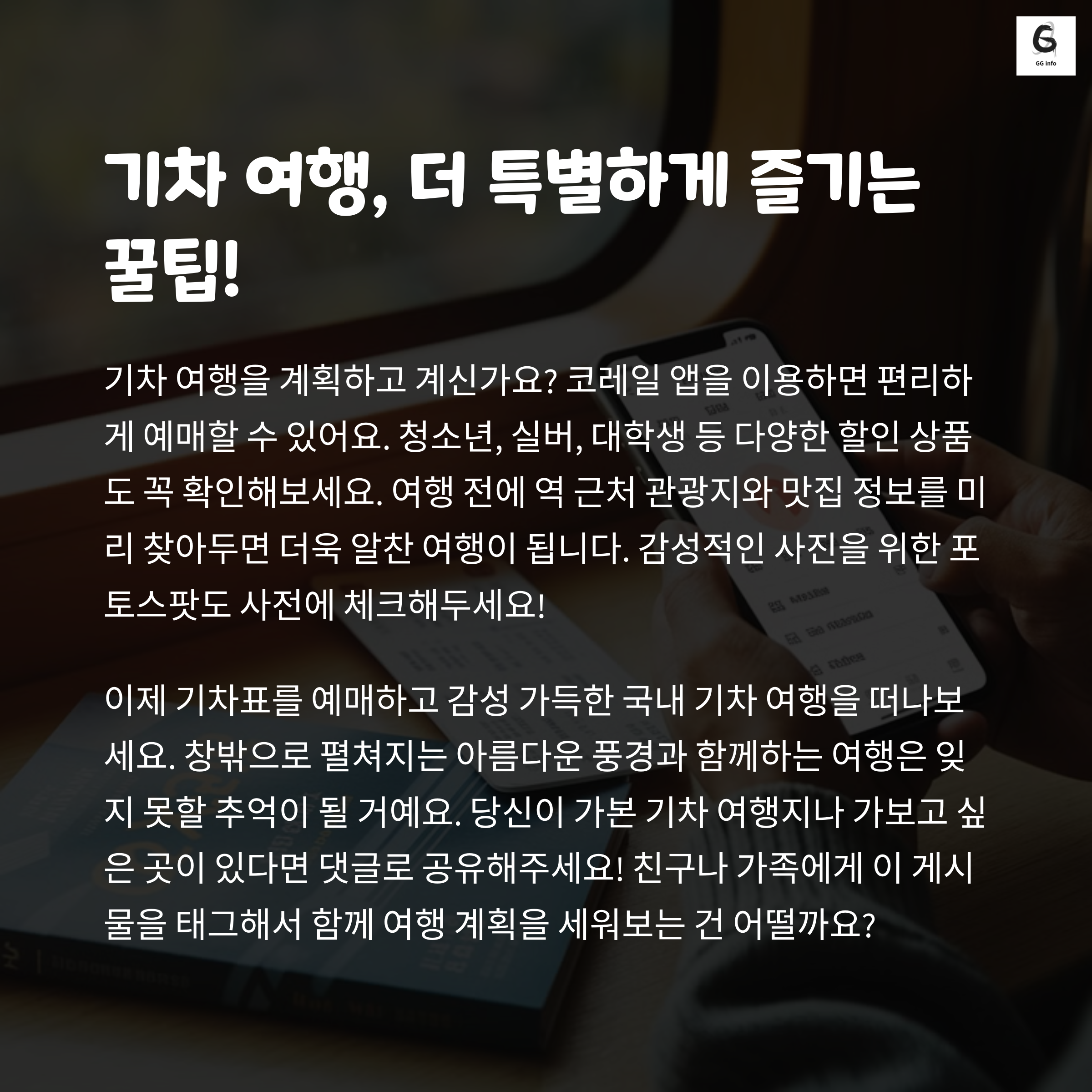 기차를 타고 떠나는 국내 여행은 편안함과 감성을 동시에 느낄 수 있는 특별한 경험입니다. 창밖으로 펼쳐지는 아름다운 풍경을 감상하며 여유로운 시간을 보내고 싶다면, 오늘 당장 기차 여행을 계획해 보세요!