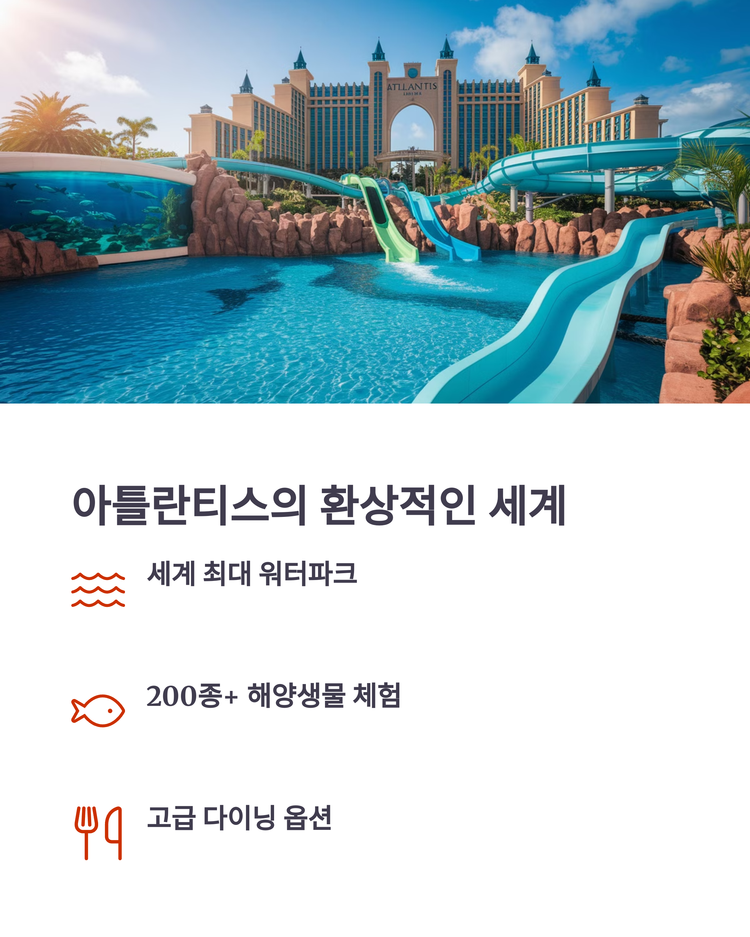 바하마에 위치한 Atlantis Paradise Island는 대형 워터파크와 함께 다양한 동물 체험을 제공합니다. 아이들이 좋아할 만한 해양 생물 관찰과 키즈 클럽이 매우 잘 갖춰져 있어요.