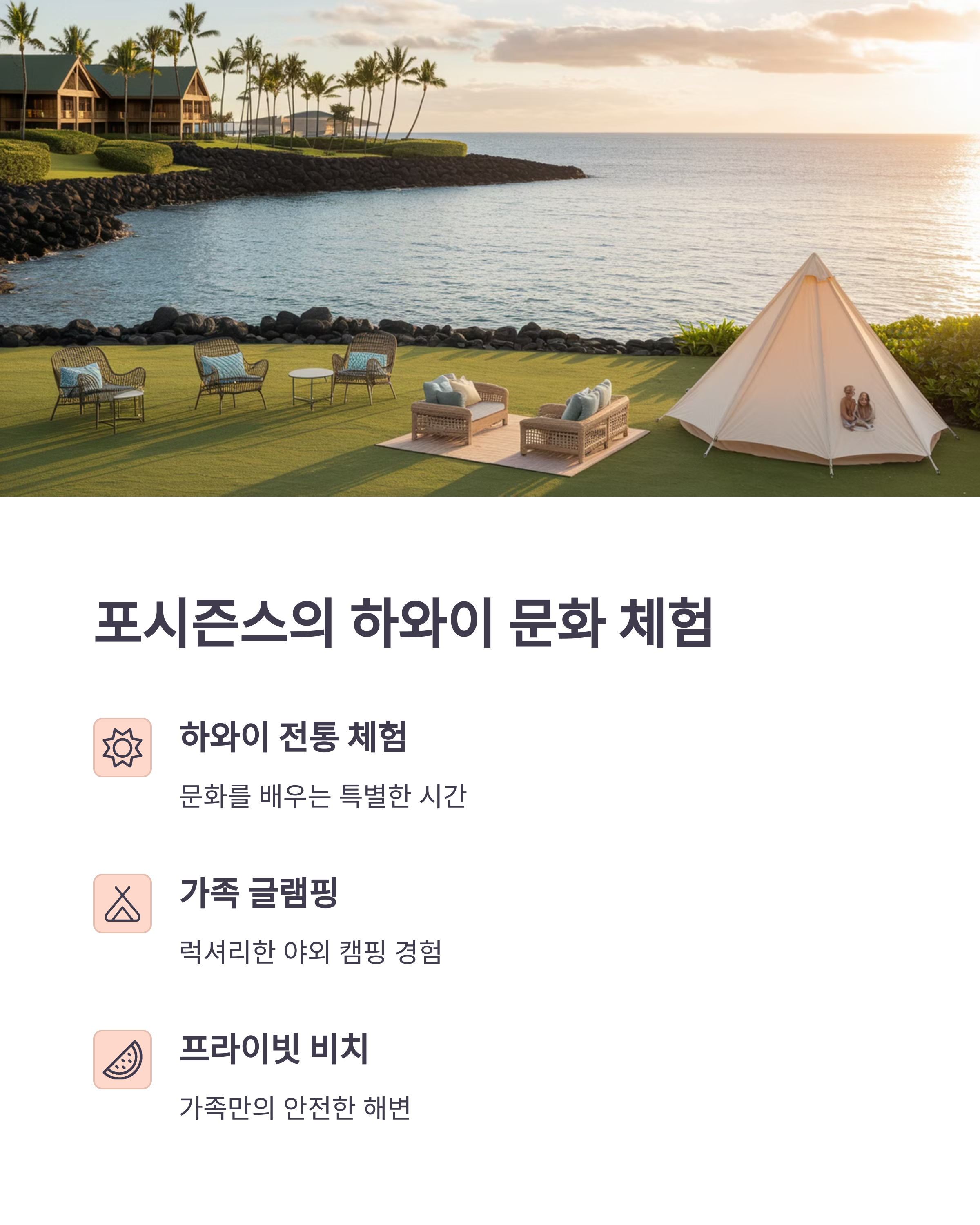 하와이식 훌라 수업, 전통 예술 체험 외에도 글램핑, 해양 스포츠 등 색다른 활동이 가능해요. 가족 단위 여행객에게 편안하면서도 특별한 경험을 제공합니다.