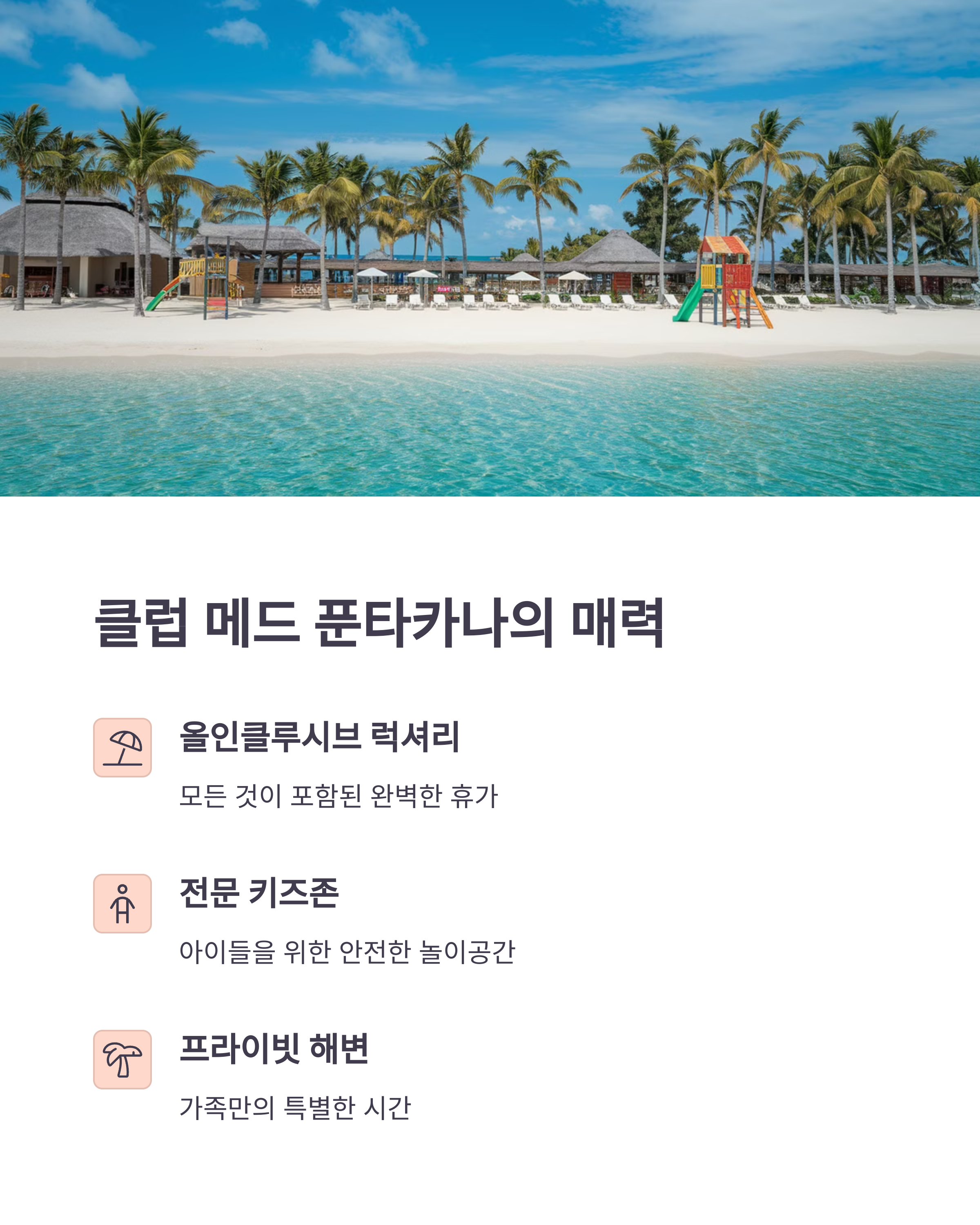 Club Med Punta Cana는 가족 여행에 최적화된 올인클루시브 리조트입니다. 전용 해변과 고급 스파, 키즈 전용 공간이 잘 마련되어 있어 아이들도 즐겁고 부모도 쉴 수 있어요.