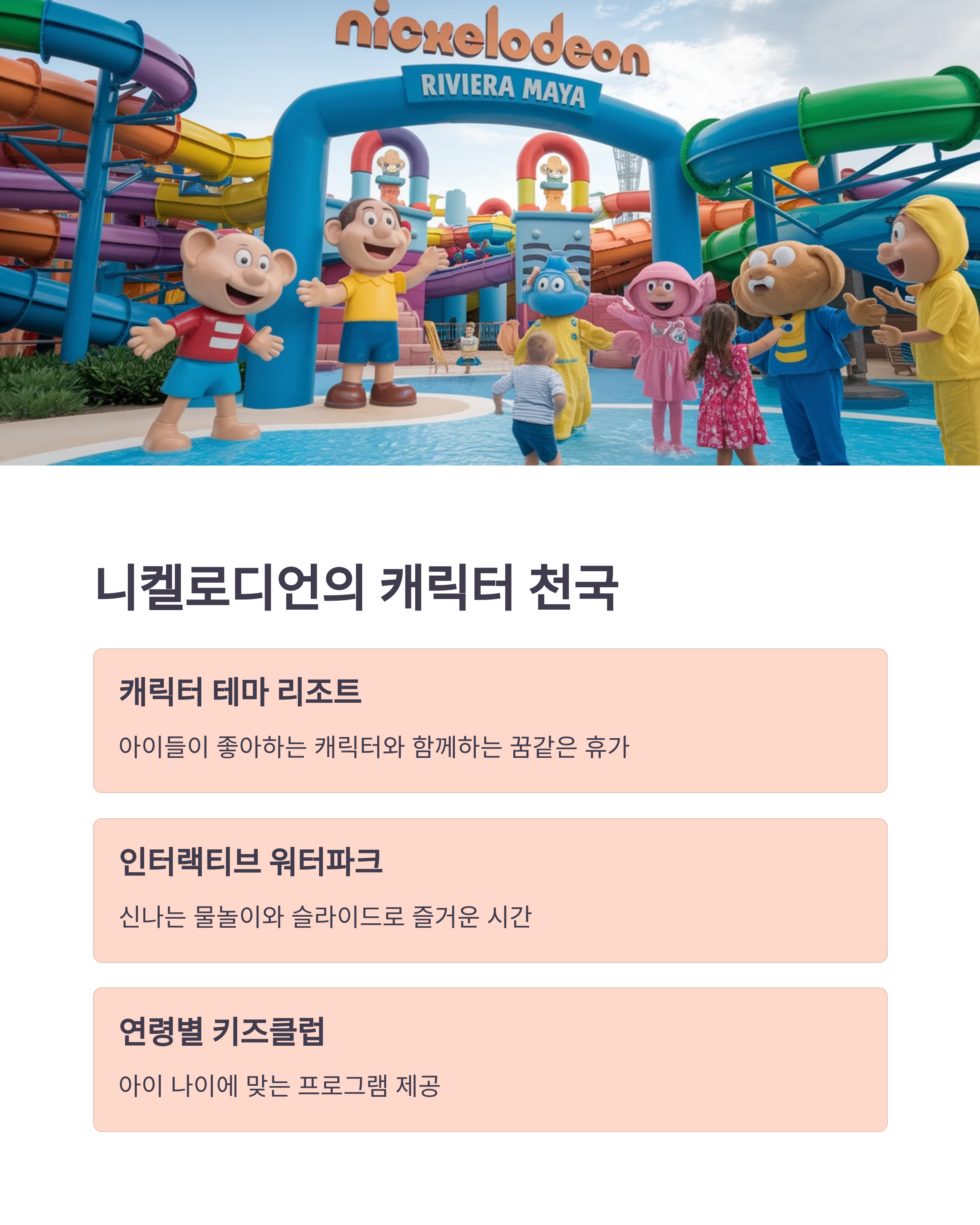 Nickelodeon 테마 리조트로 유명한 이곳은 아이들이 좋아하는 캐릭터 기반 활동이 가득합니다. 물놀이를 즐길 수 있는 대형 워터파크와 다양한 키즈 프로그램도 마련되어 있어요.