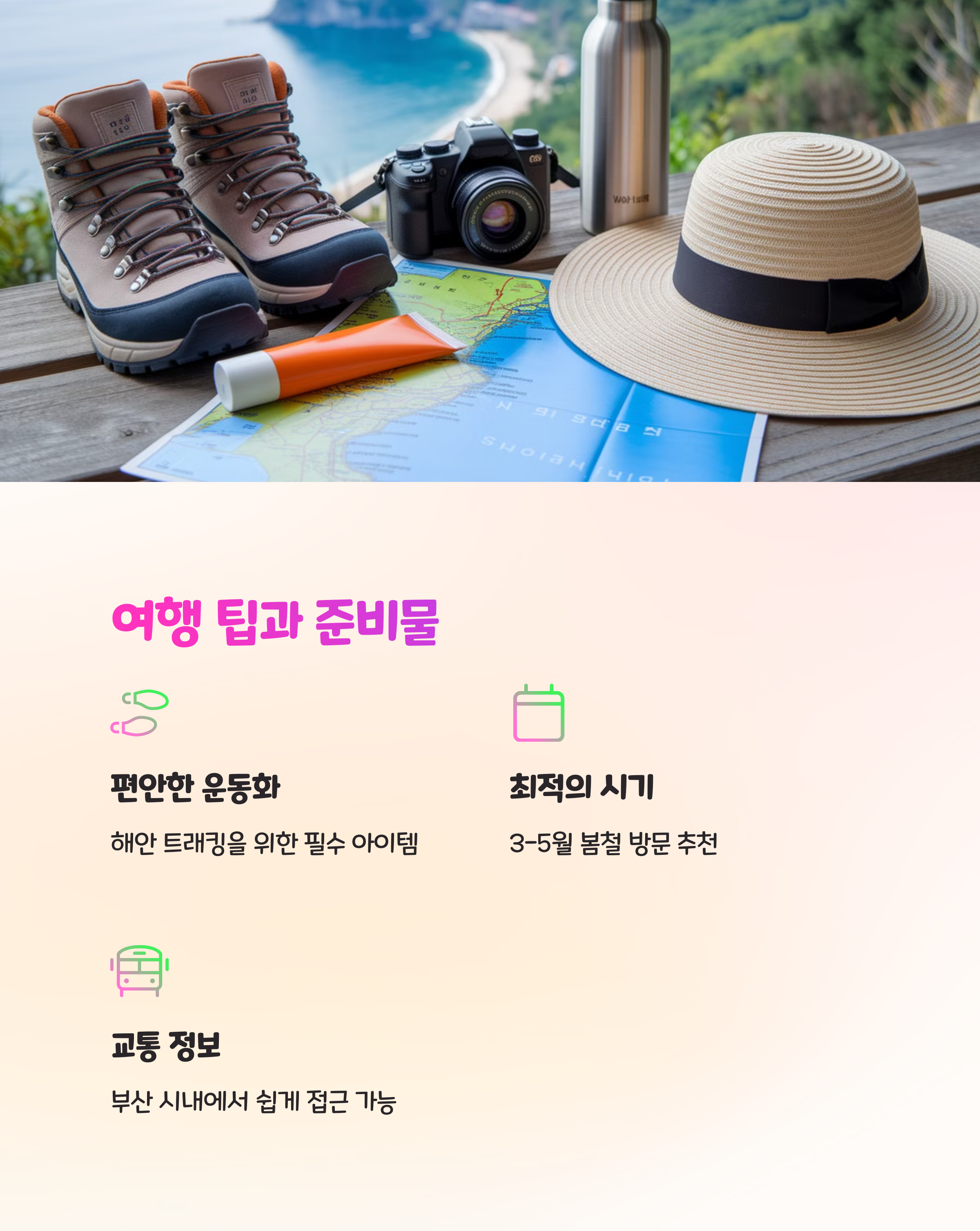 트래킹을 즐기고, 사진을 찍고, 맛있는 현지 음식을 즐기며 하루를 알차게 보내기에 완벽한 코스입니다. 부산의 자연과 사람들을 온전히 느낄 수 있는 여행이 될 것입니다.