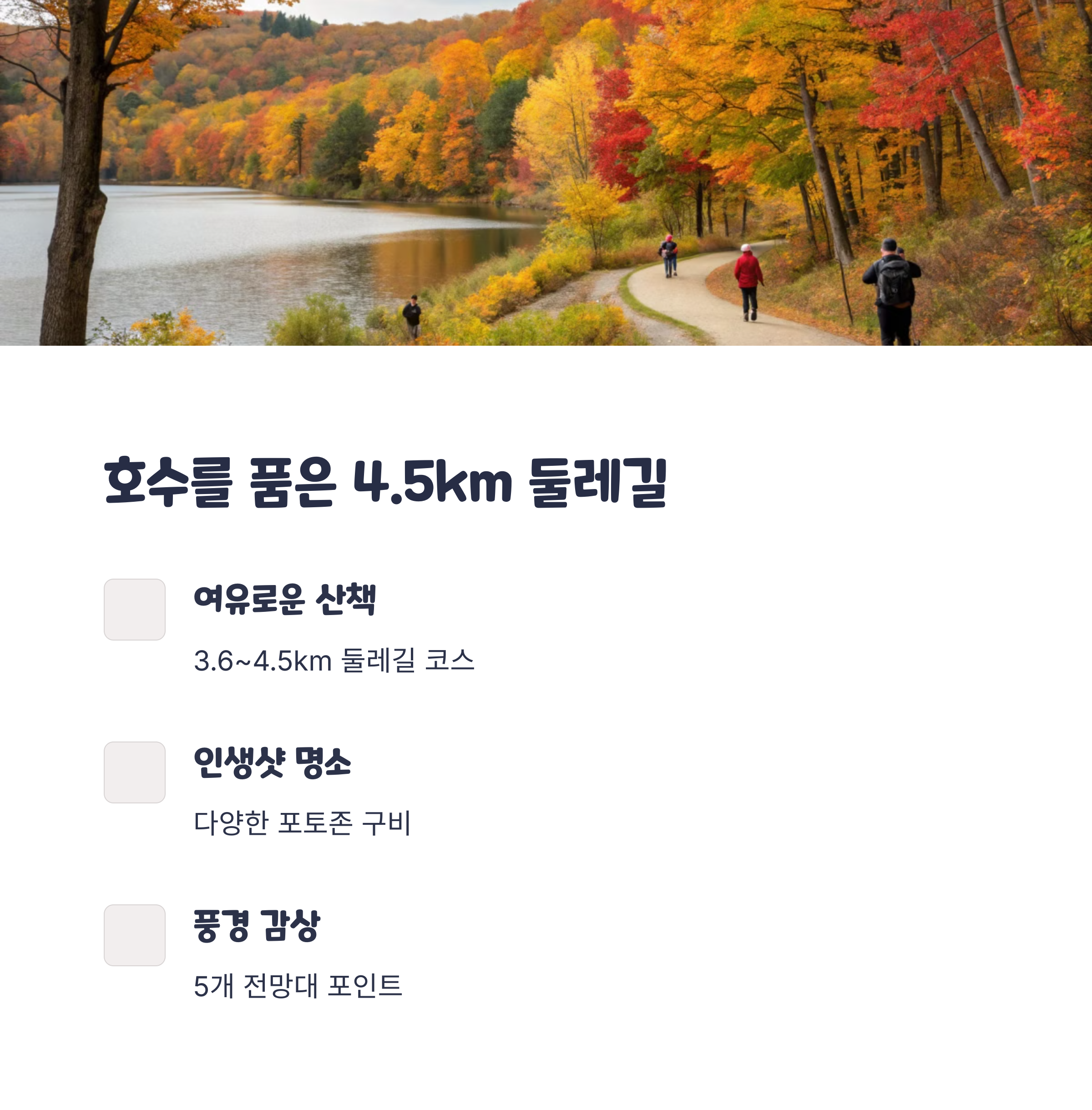 출렁다리를 지난 후에는 마장호수 둘레길 산책도 꼭 추천합니다. 전체 길이는 약 3.6km에서 4.5km로, 걸으면서 다양한 포토존과 조망 좋은 전망대를 만날 수 있습니다.