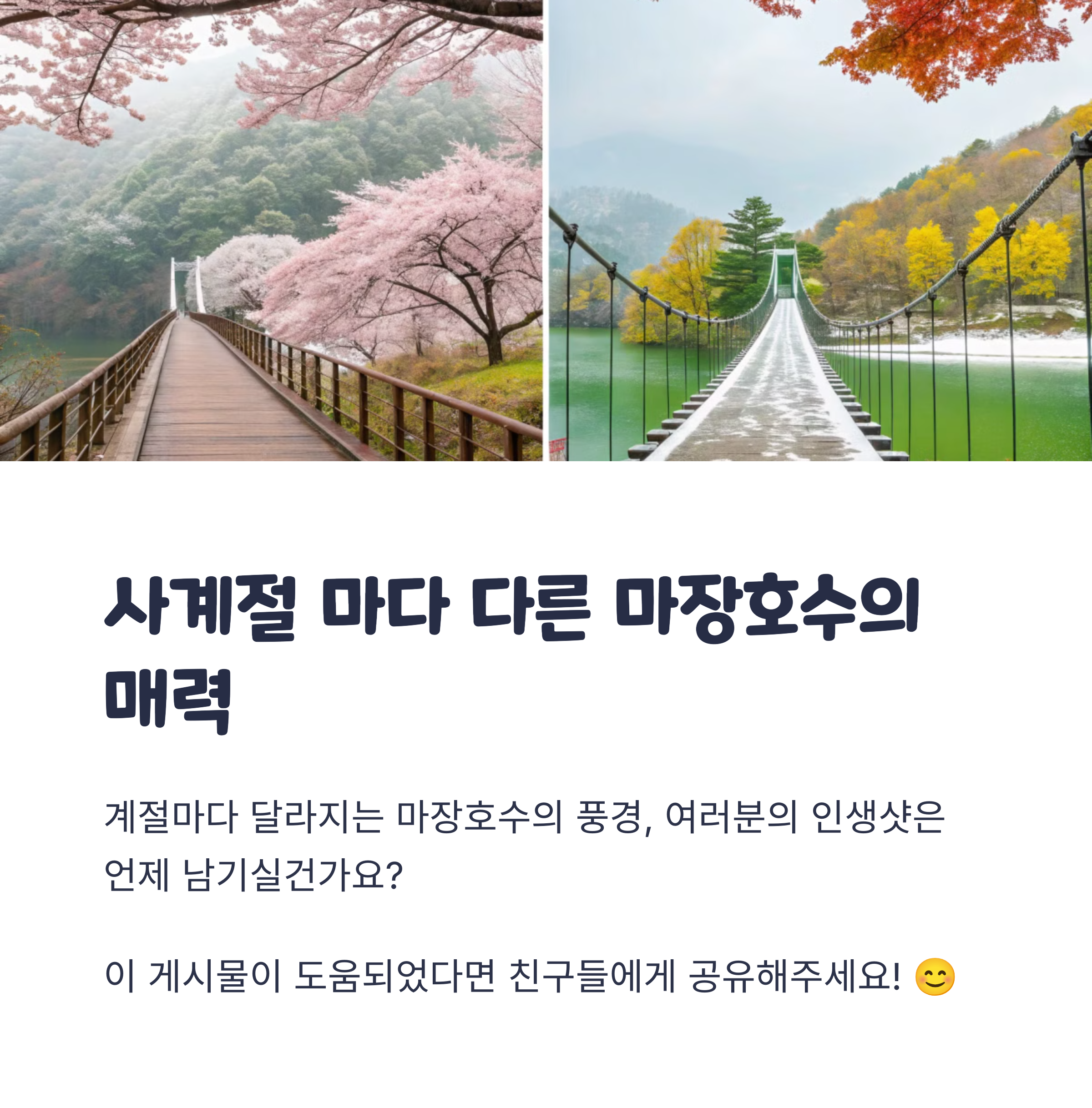 마장호수는 단순한 출렁다리 명소를 넘어, 곳곳에 마련된 포토존과 쉼터로도 유명합니다. 풍경을 배경으로 한 조형물과 야외 벤치, 데크 산책길이 잘 조성돼 있어 사진 찍기 좋은 명소들이 많습니다.