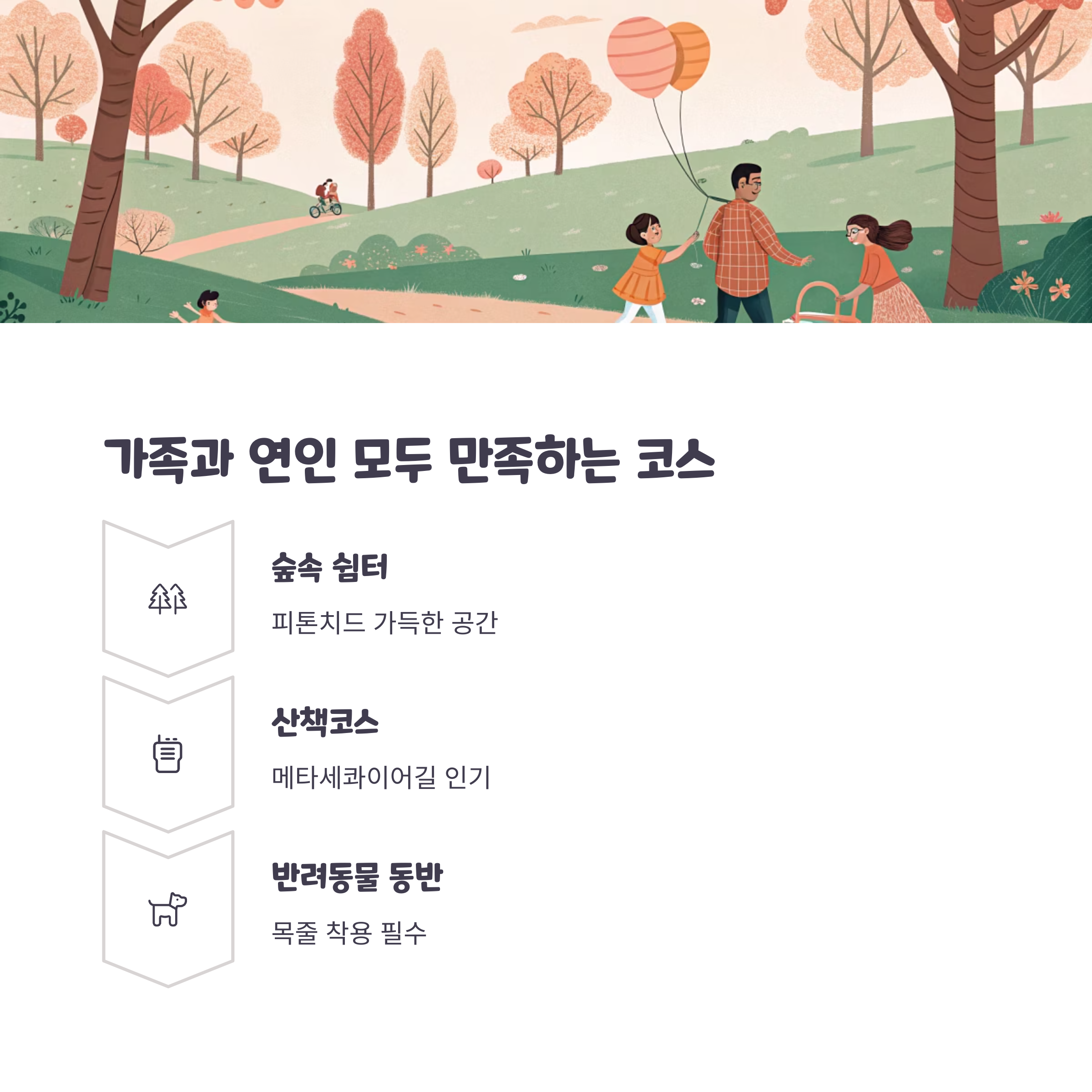 천천히 걷다 쉬며 대화를 나누기에도 안성맞춤입니다.