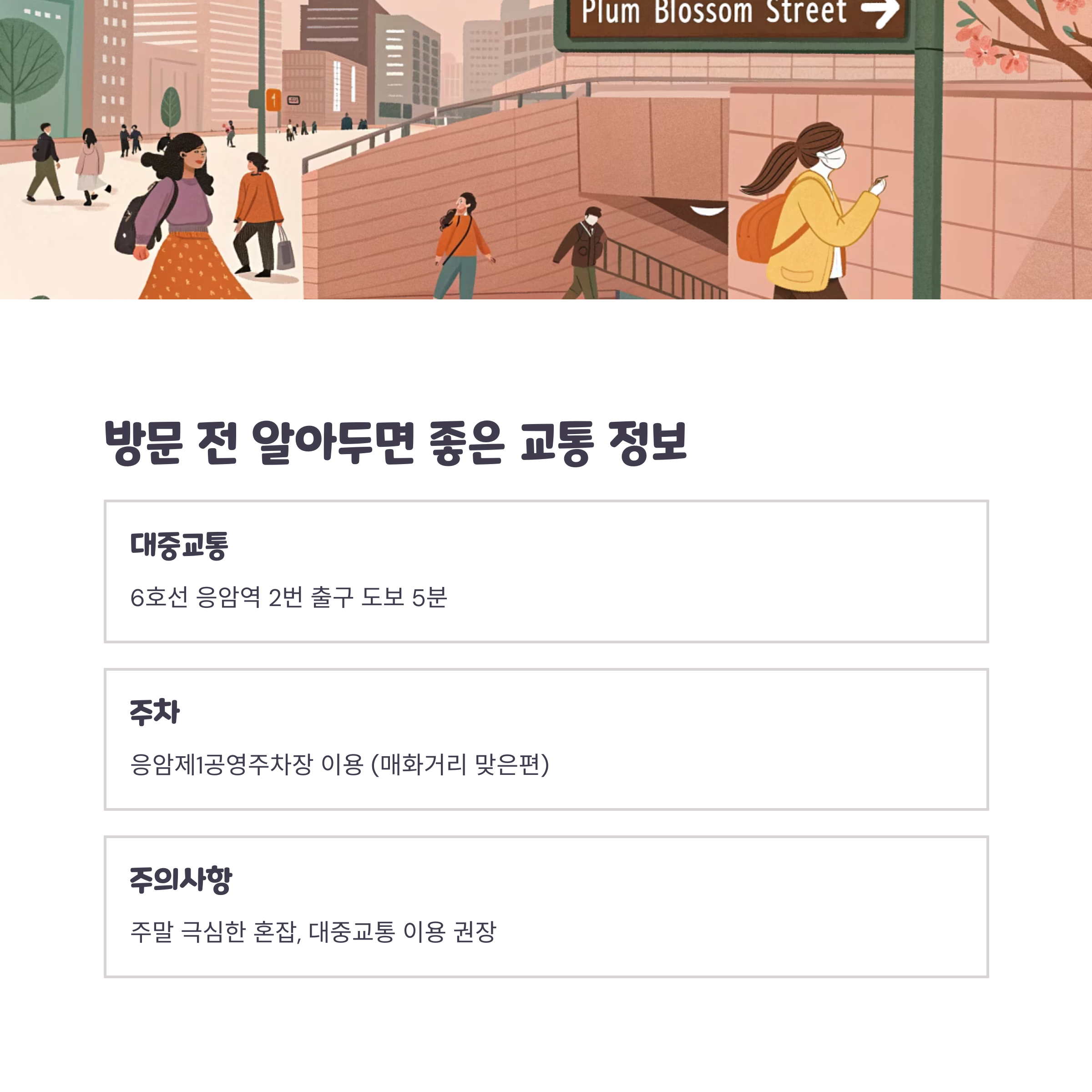 주말엔 다소 혼잡할 수 있으니 대중교통 이용을 추천드립니다.