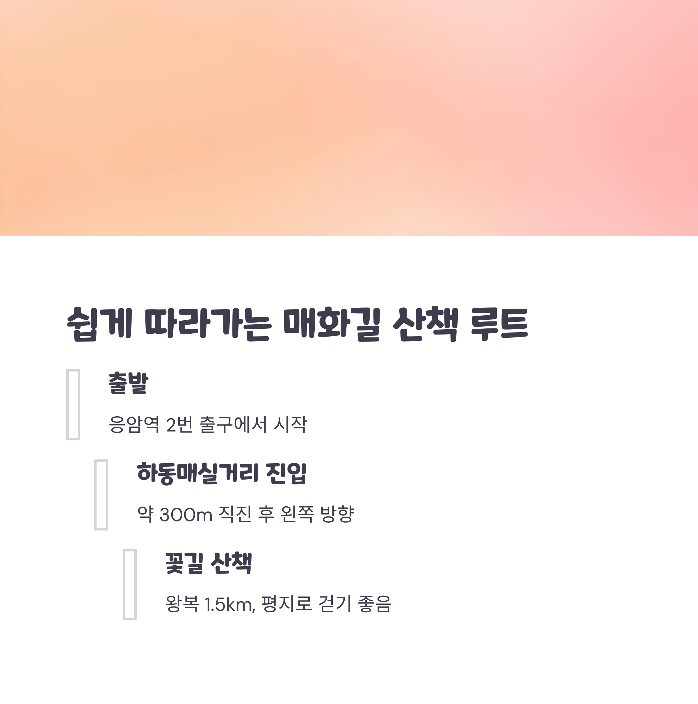 총 소요 시간은 약 20~30분, 매화를 보며 산책하기 딱 좋습니다.