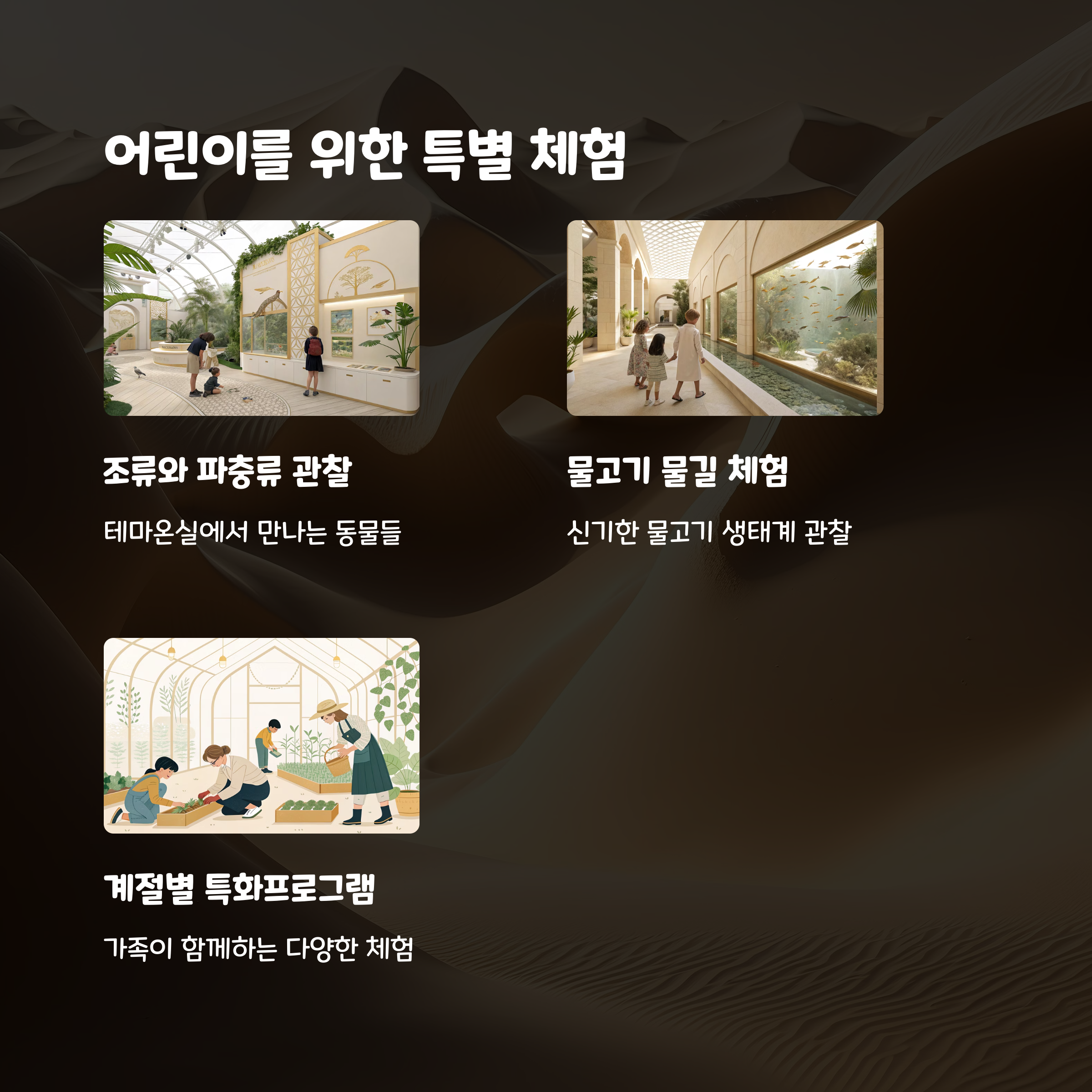 | 열대우림관 | 열대 식물과 작은 폭포 | 가족 단위 관람객 |