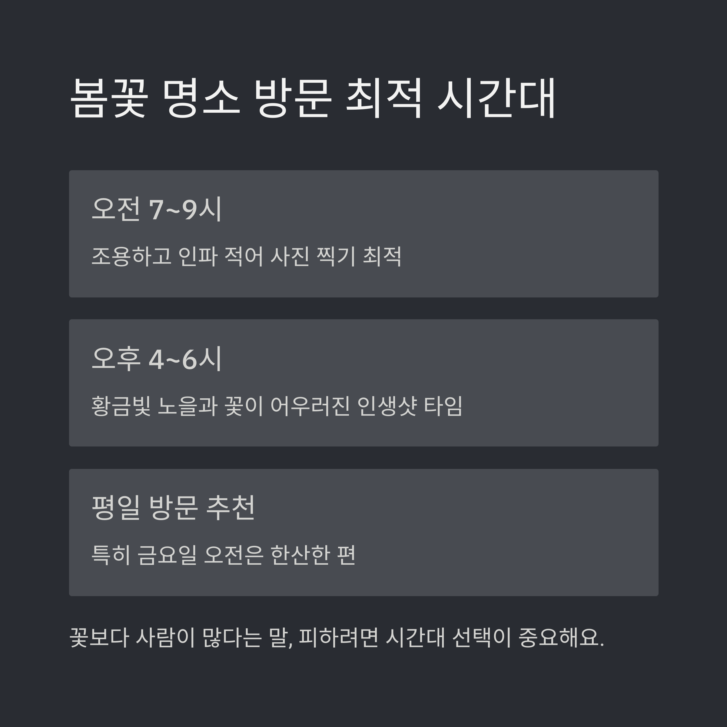 "봄꽃 명소별로 방문 일정을 조율하면 최적의 풍경을 즐길 수 있어요!"