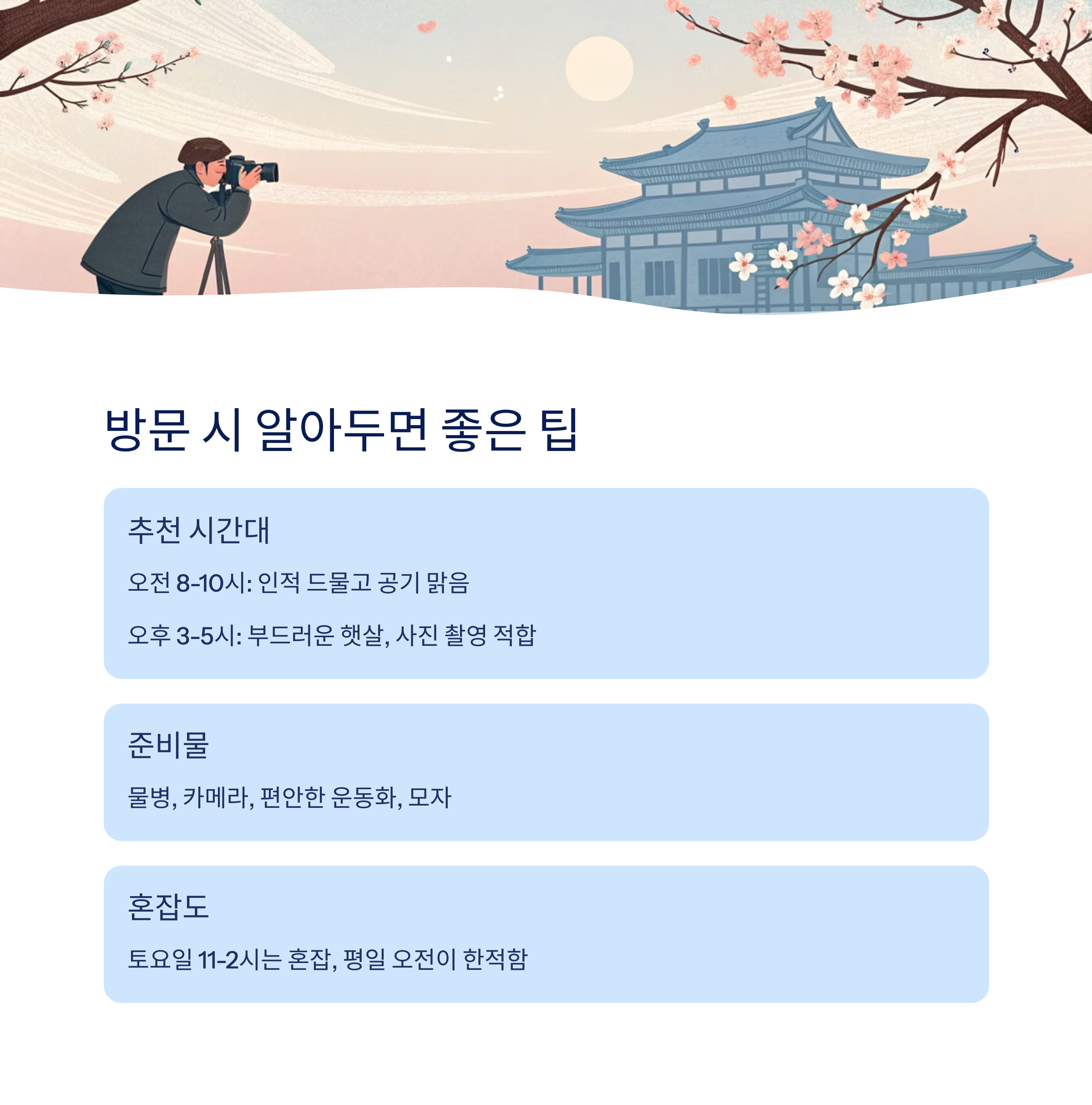 | 오후 3시~5시 | 따뜻함 | 햇살이 부드럽고 사진 찍기 적합 |