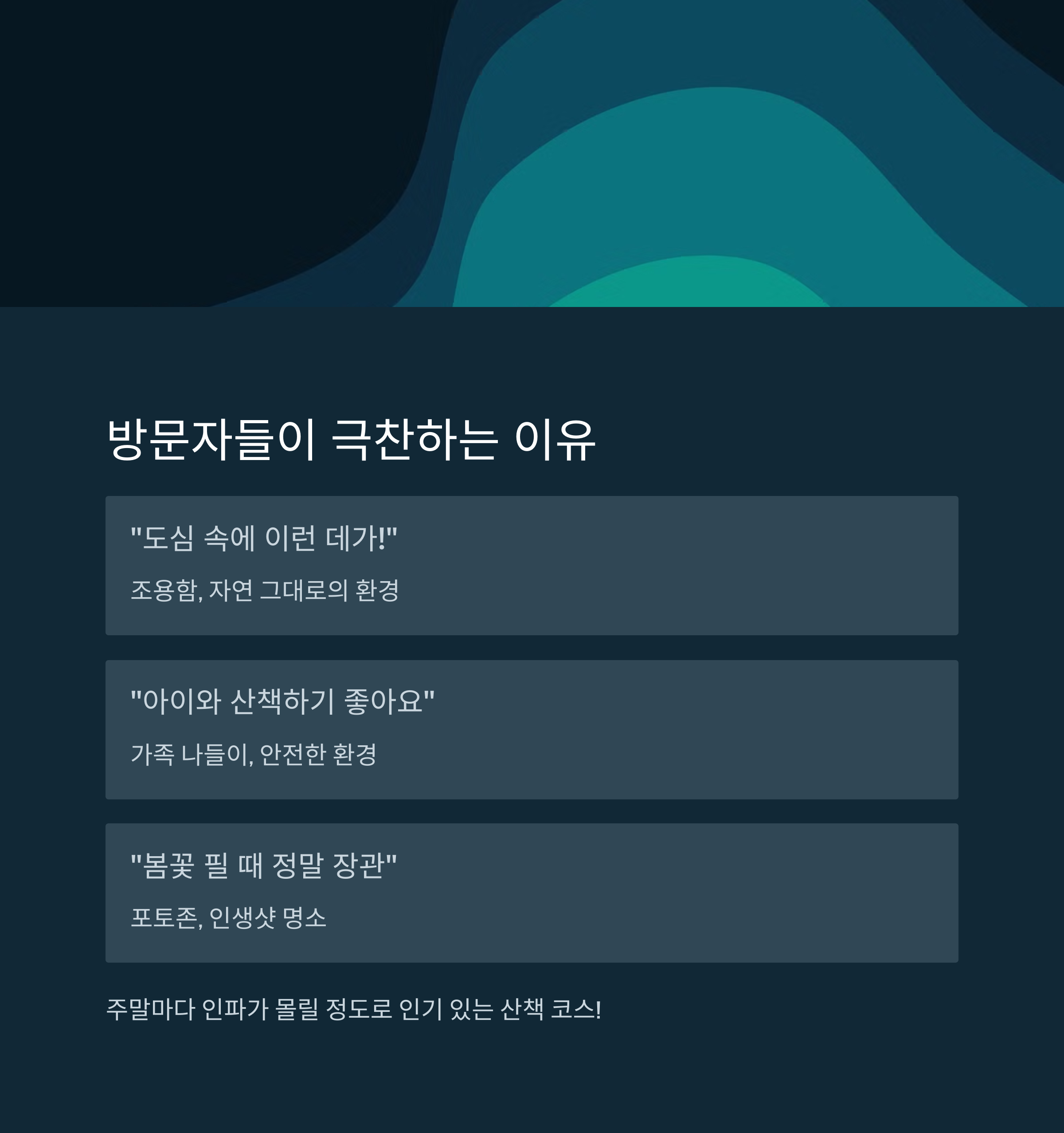 | "도심 속에 이런 데가 있었다니!" | 조용함, 자연 그대로 |