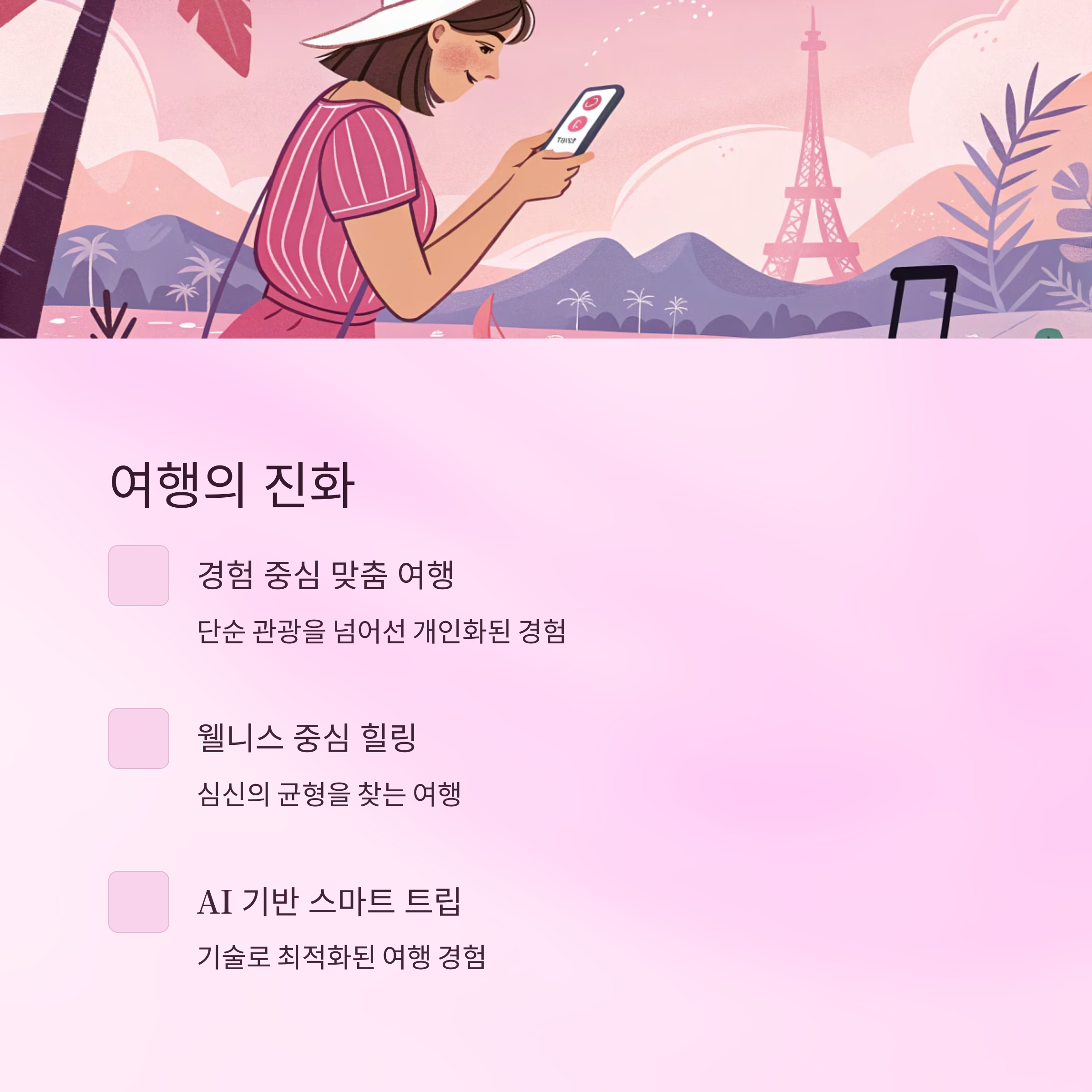 이제는 단순한 관광을 넘어 경험 중심의 맞춤 여행, 웰니스 중심의 힐링 여행, AI 기반 스마트 트립이 중심입니다.