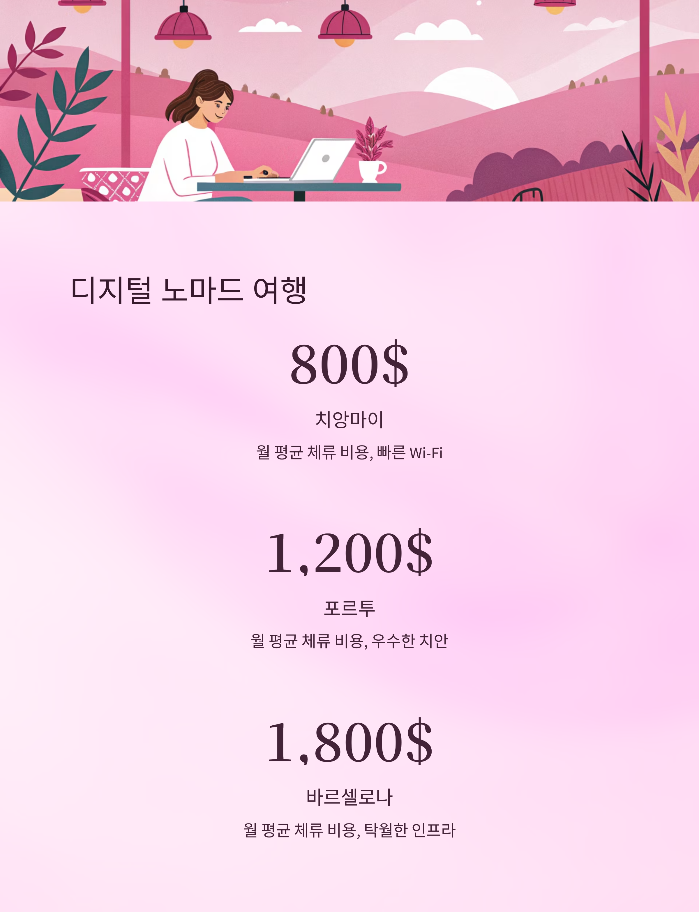도시 평균 체류 비용 (월) Wi-Fi 속도 장점
