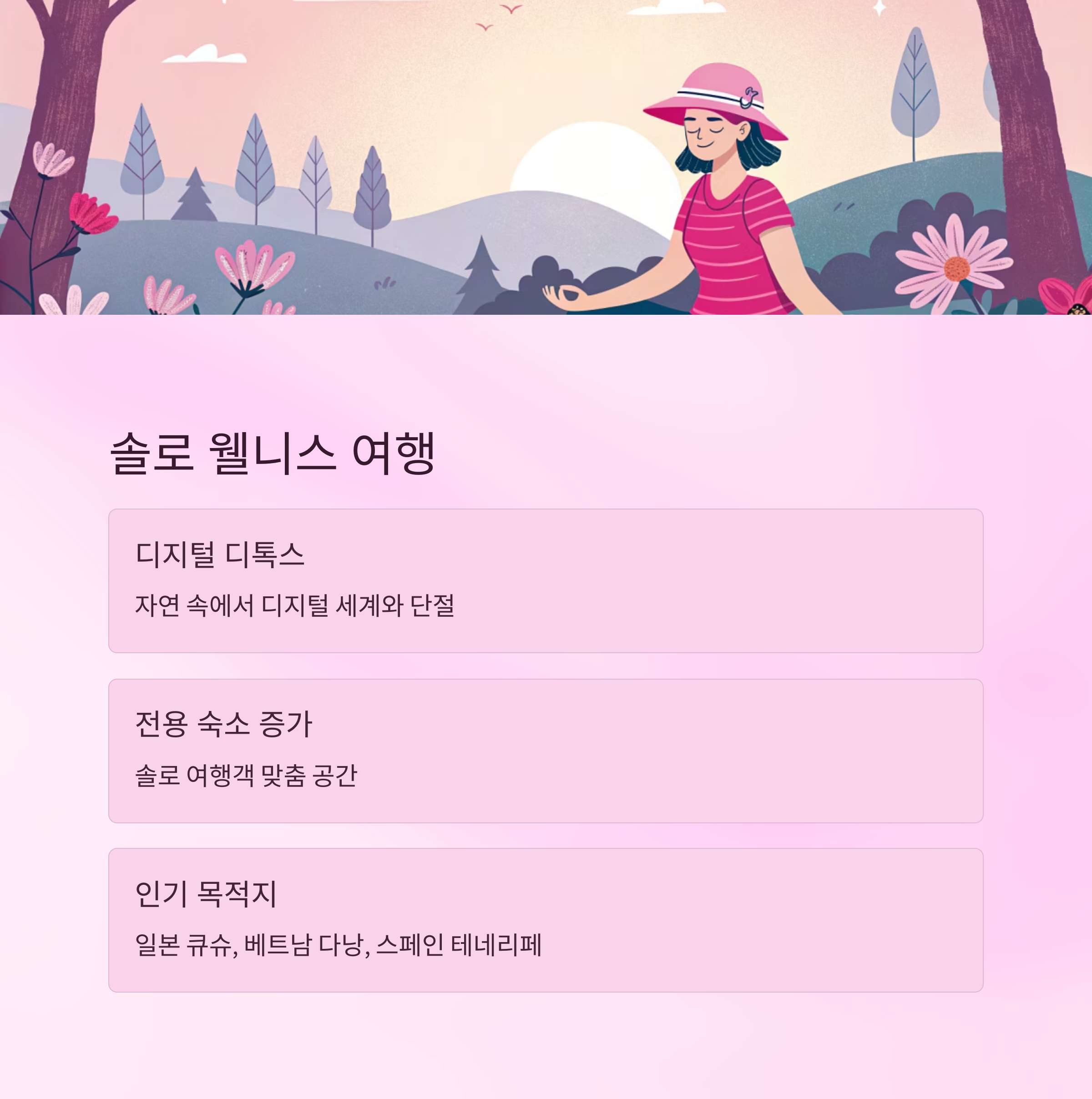 **디지털 디톡스와 자연 치유를 동시에 추구하는 ‘웰니스 혼행’**이 대세로 자리잡고 있습니다.