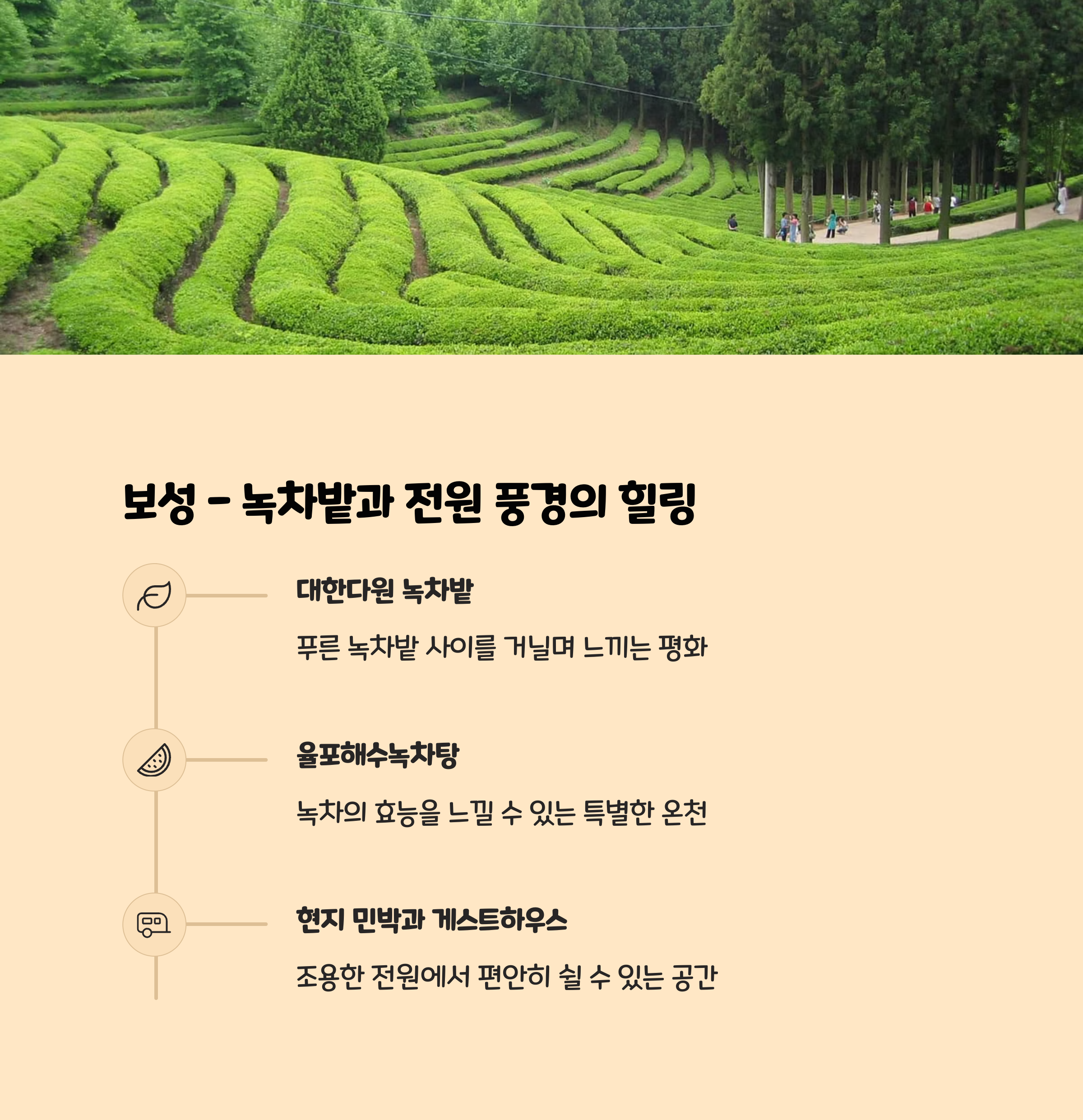 전라남도 보성은 대한다원 녹차밭과 율포해수녹차탕이 있는 힐링 명소입니다.