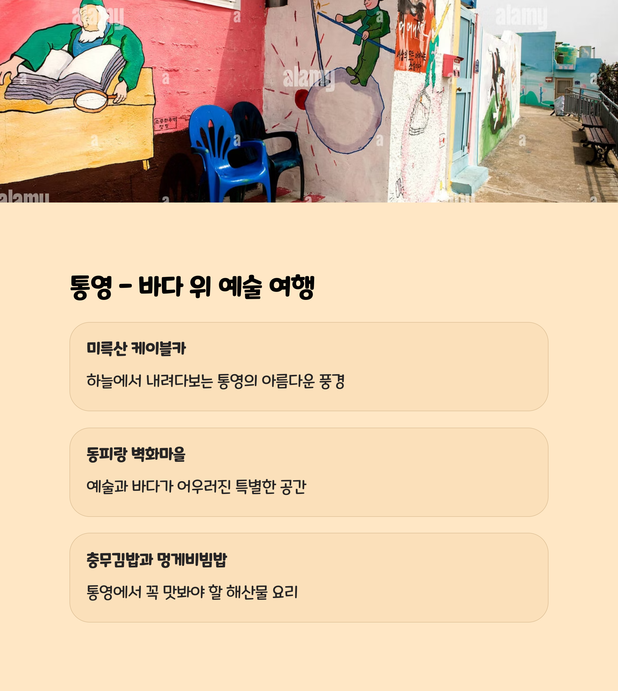 통영은 미륵산 케이블카, 동피랑 벽화마을, 그리고 욕지도까지 다양한 매력을 지닌 항구 도시입니다.