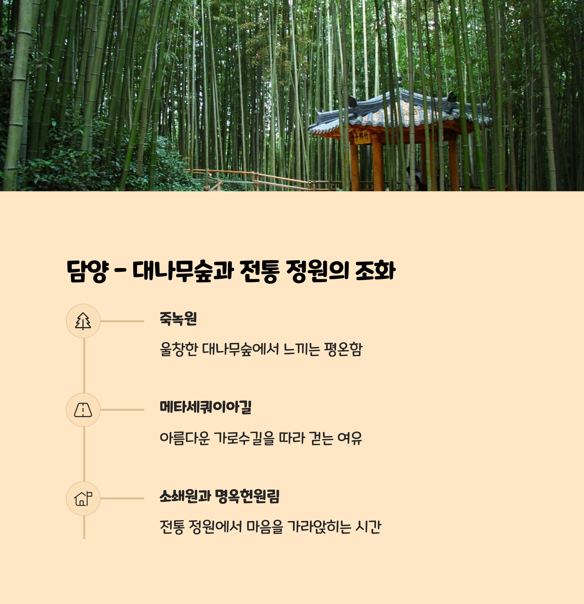 | 담양 | 대나무숲 | 떡갈비, 국수 | 한옥 |