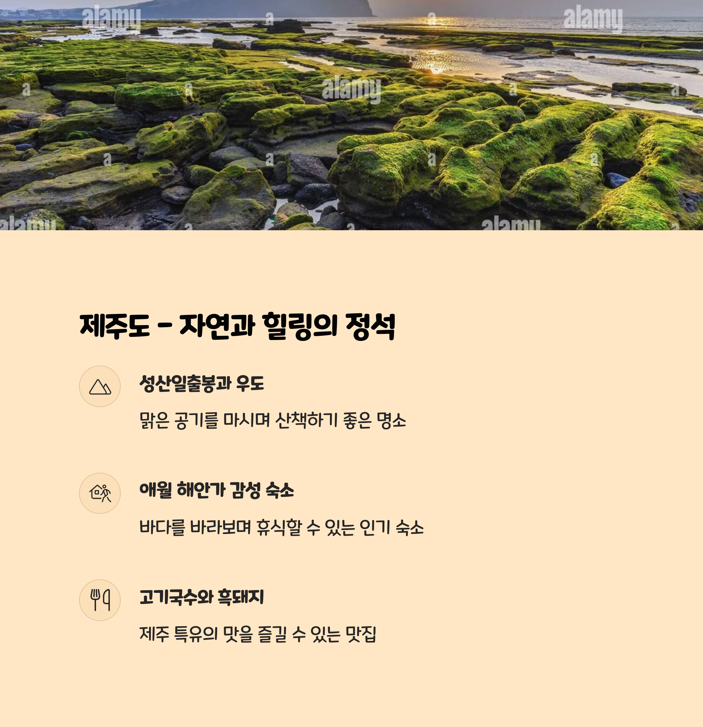 | 제주 | 자연, 바다 | 흑돼지, 고기국수 | 감성 펜션 |