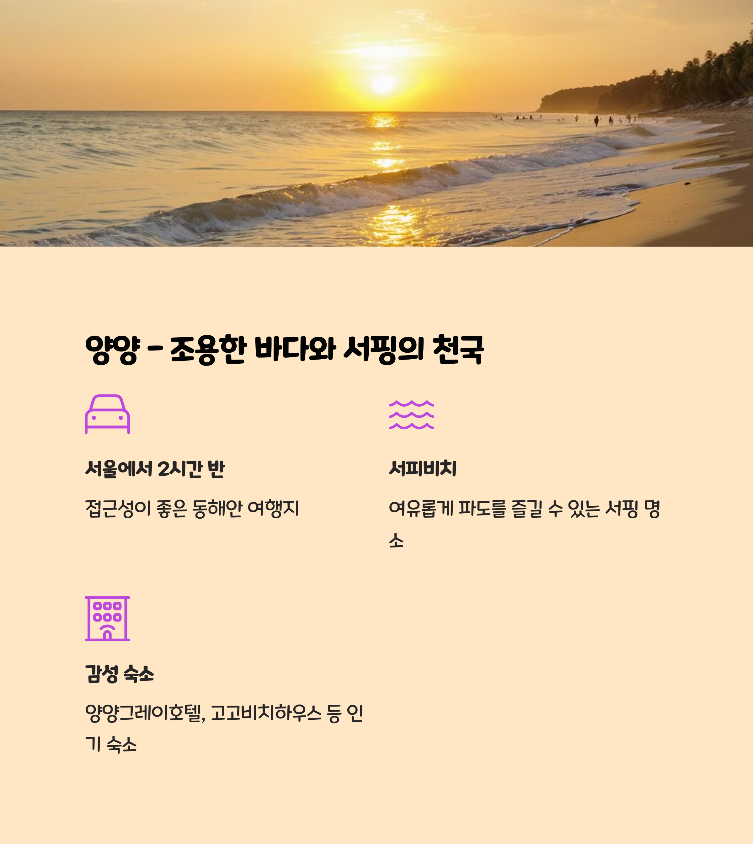 | 양양 | 서핑, 해변 | 해물칼국수 | 비치하우스 |
