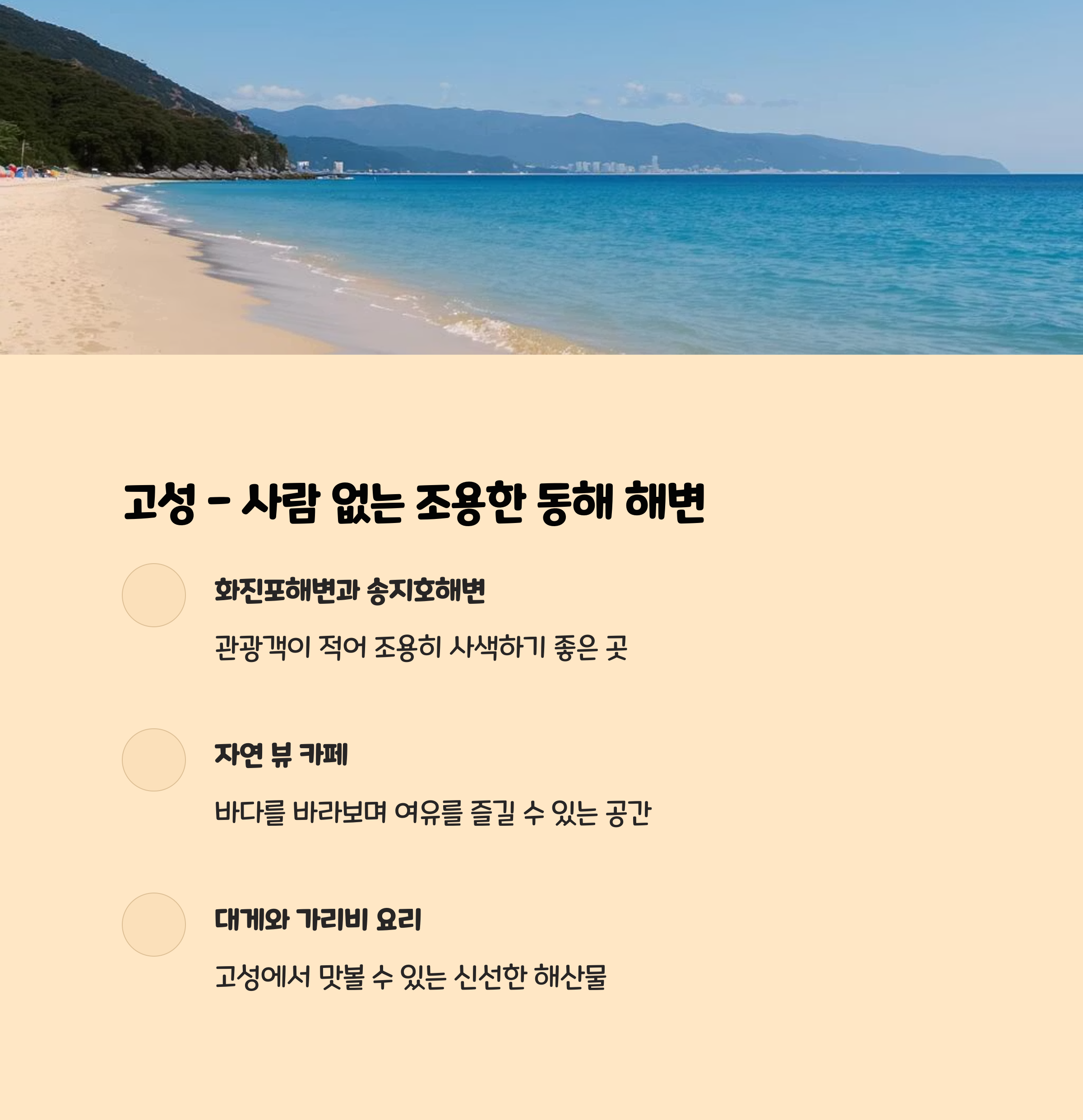 | 고성 | 조용한 해변 | 대게, 가리비 | 민박 |