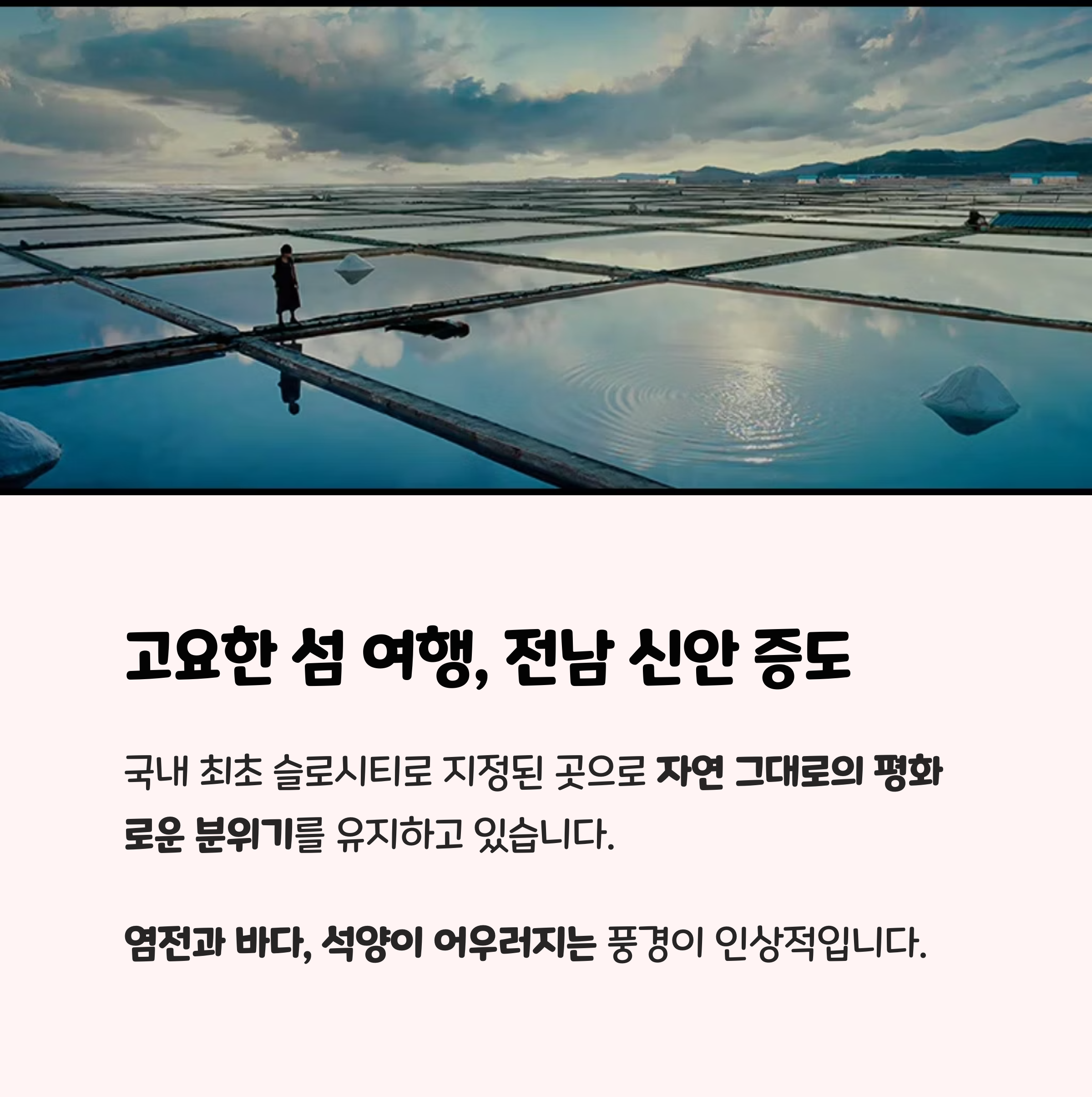 | 전남 증도 | 슬로시티, 염전, 자전거길 | 봄, 가을 |