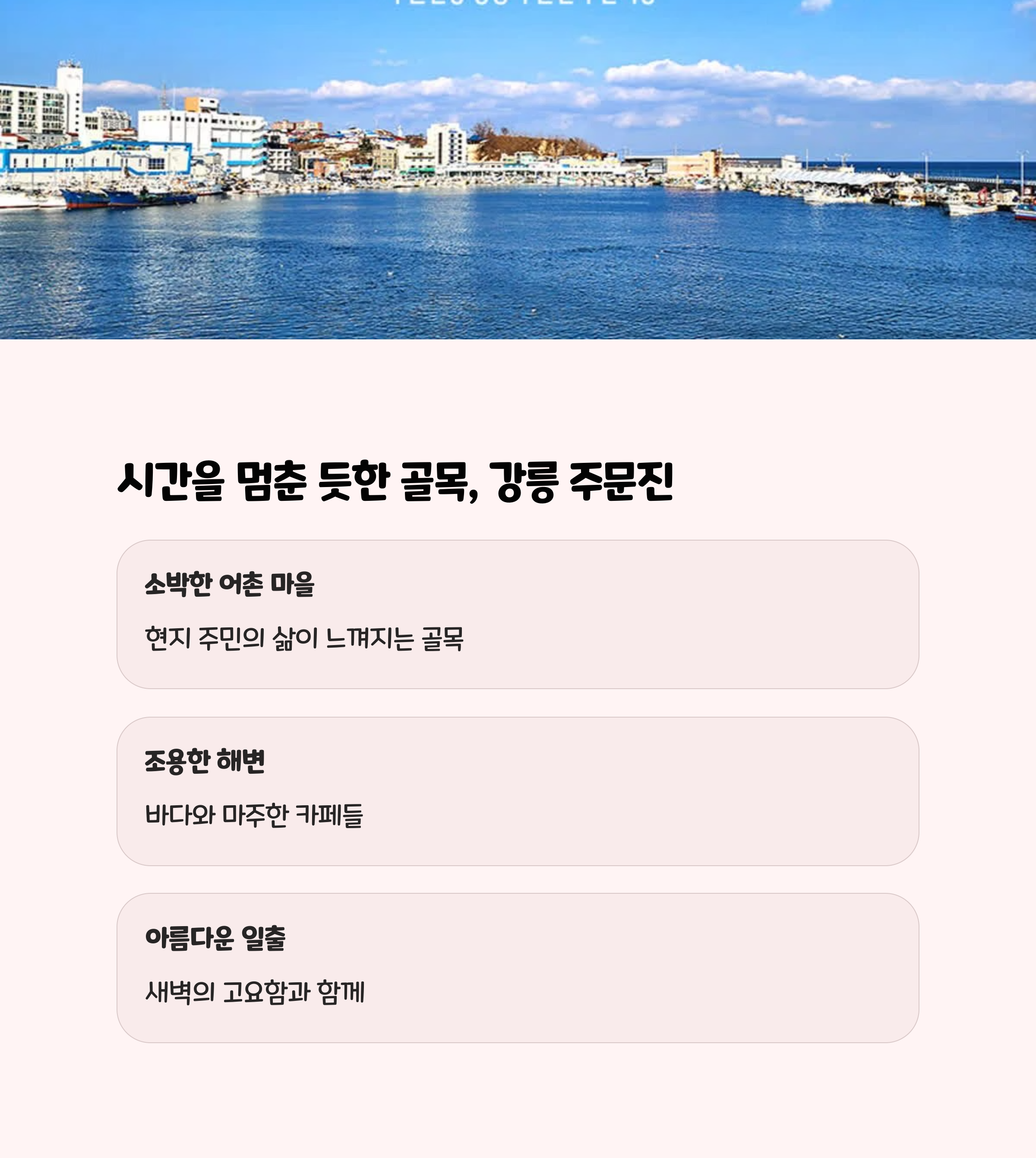 | 강릉 주문진 | 해변, 골목 산책, 어촌 감성 | 사계절 |