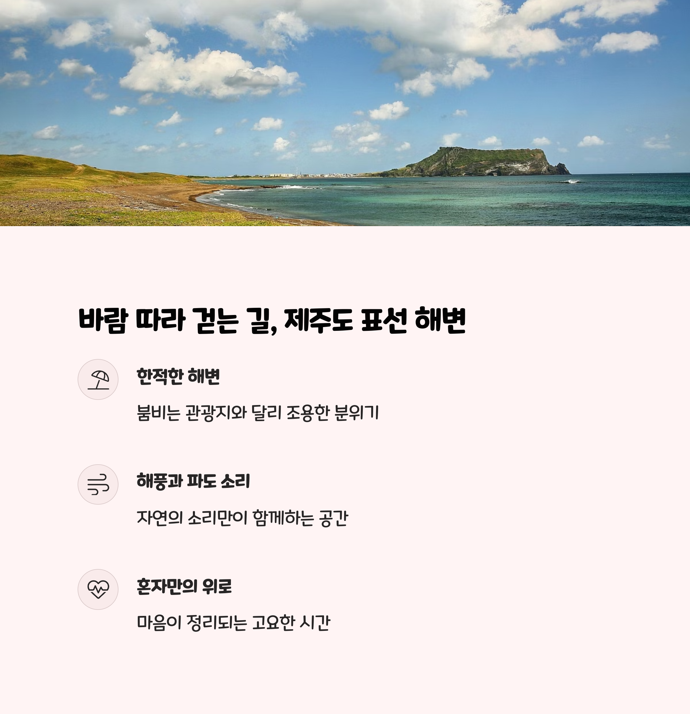 | 제주 표선 | 한적한 해변, 바람길 | 봄, 여름 |