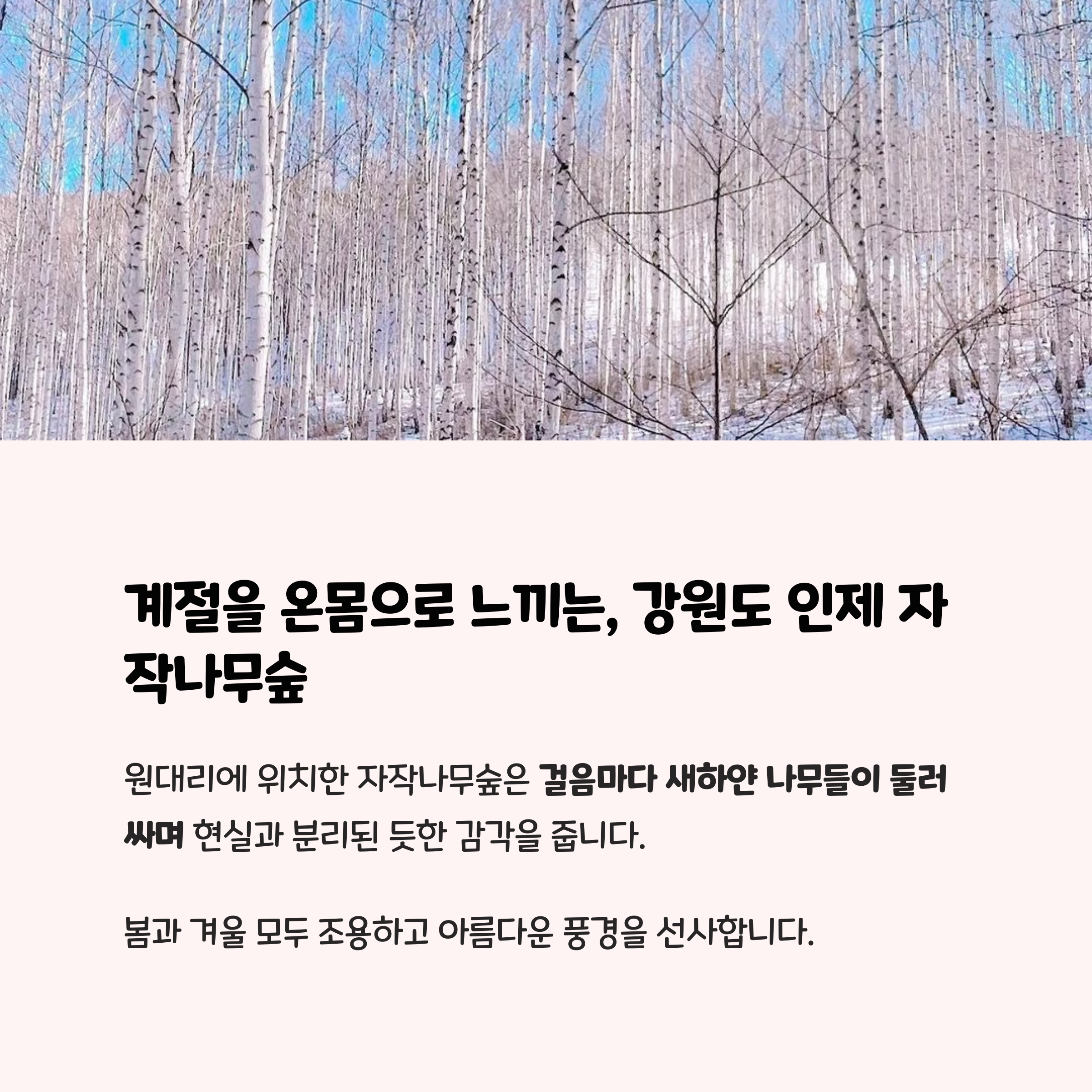| 인제 자작숲 | 숲속 트레킹, 사색하기 좋음 | 여름, 겨울 |