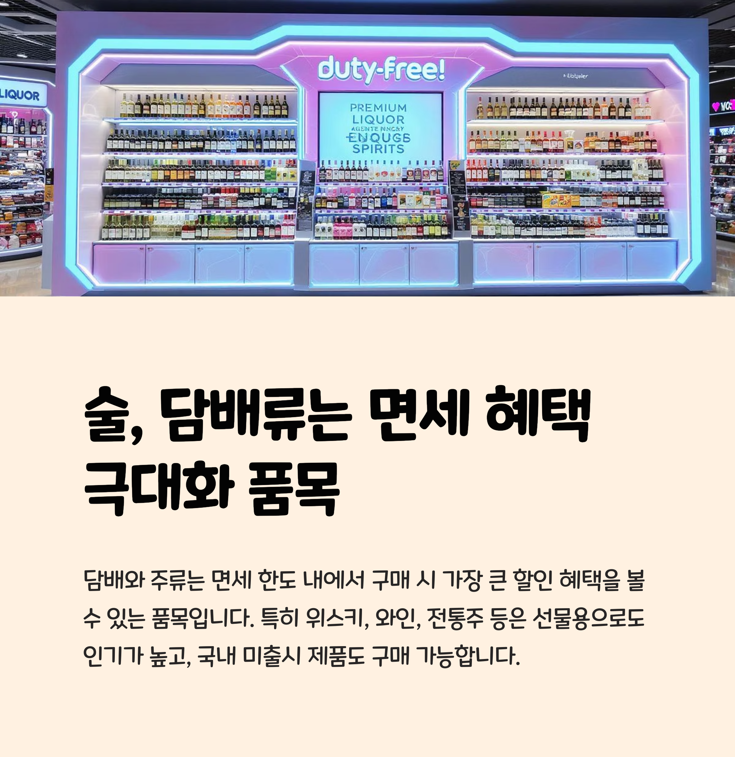 담배와 주류는 면세 한도 내에서 구매 시 가장 큰 할인 혜택을 볼 수 있는 품목입니다.